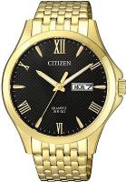 Мужские наручные часы Citizen Basic BF2022-55H. Точный кварцевый механизм с аналоговой индикацией. Браслет из нержавеющей стали. Аккумулятор обеспечивает часы достаточным питанием приблизительно на 2 года. Браслет из нержавеющей стали. Прочное, устойчивое к царапинам минеральное стекло защищает часы от повреждений. На циферблате отображается текущее число месяца и день недели. Часы являются водонепроницаемыми до 5 Бар. Цвет циферблата: Желтое золото. Цвет корпуса: Черный. На стрелки и отметки нанесен светонакопительный состав, благодаря этому считывать информацию с циферблата возможно и в темноте. Толщина: 9 мм. Гарантия: 2 года.