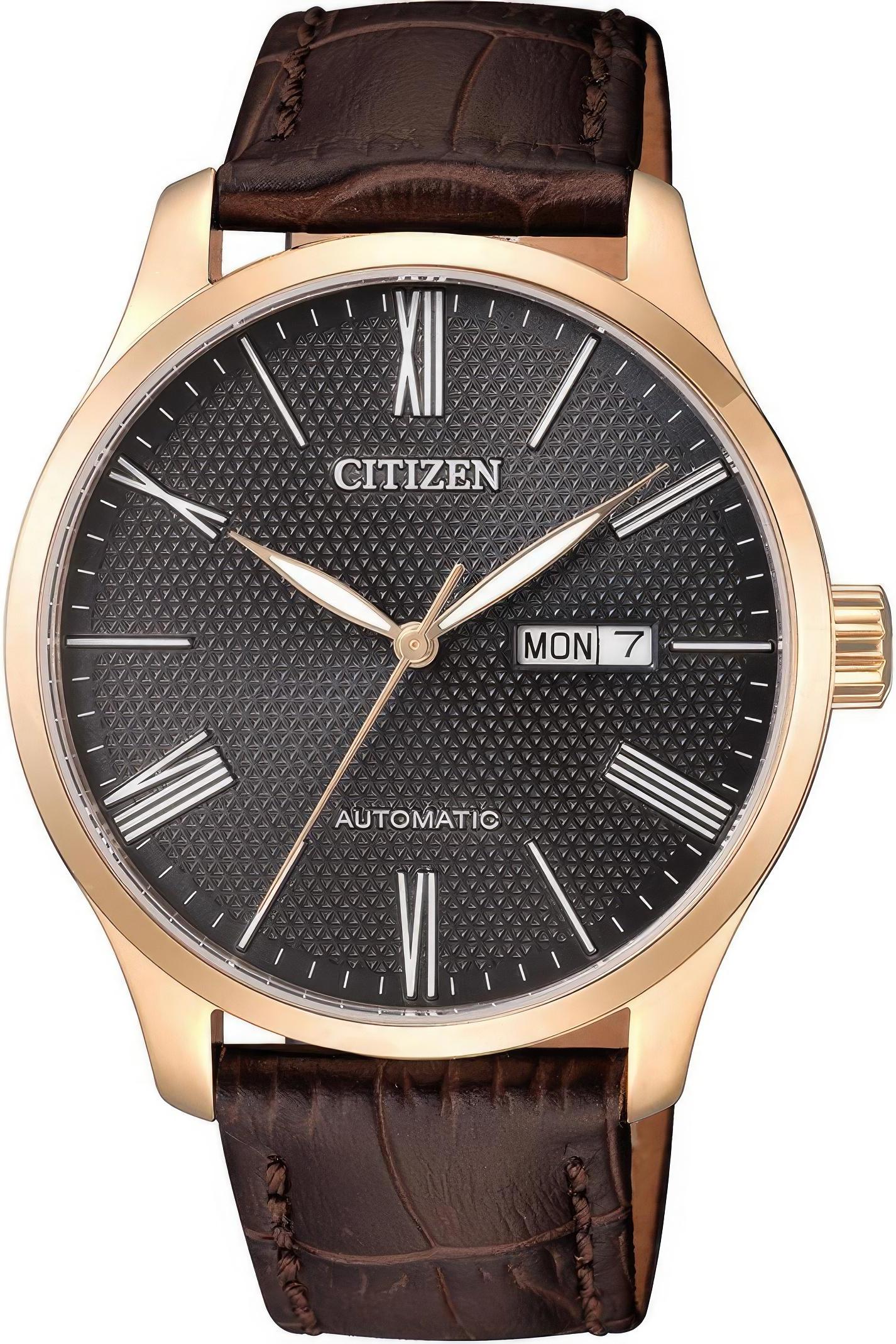 Мужские наручные часы Citizen Automatic NH8353-00H. Механические с ручным подзаводом. Ремешок изготовлен из кожи. Браслет из нержавеющей стали. Прочное, устойчивое к царапинам минеральное стекло защищает часы от повреждений. На циферблате отображается текущее число месяца и день недели. Часы являются водонепроницаемыми до 5 Бар. Цвет циферблата: Желтое золото. Цвет корпуса: Черный. На стрелки и отметки нанесен светонакопительный состав, благодаря этому считывать информацию с циферблата возможно и в темноте. Толщина: 12 мм. Гарантия: 2 года.
