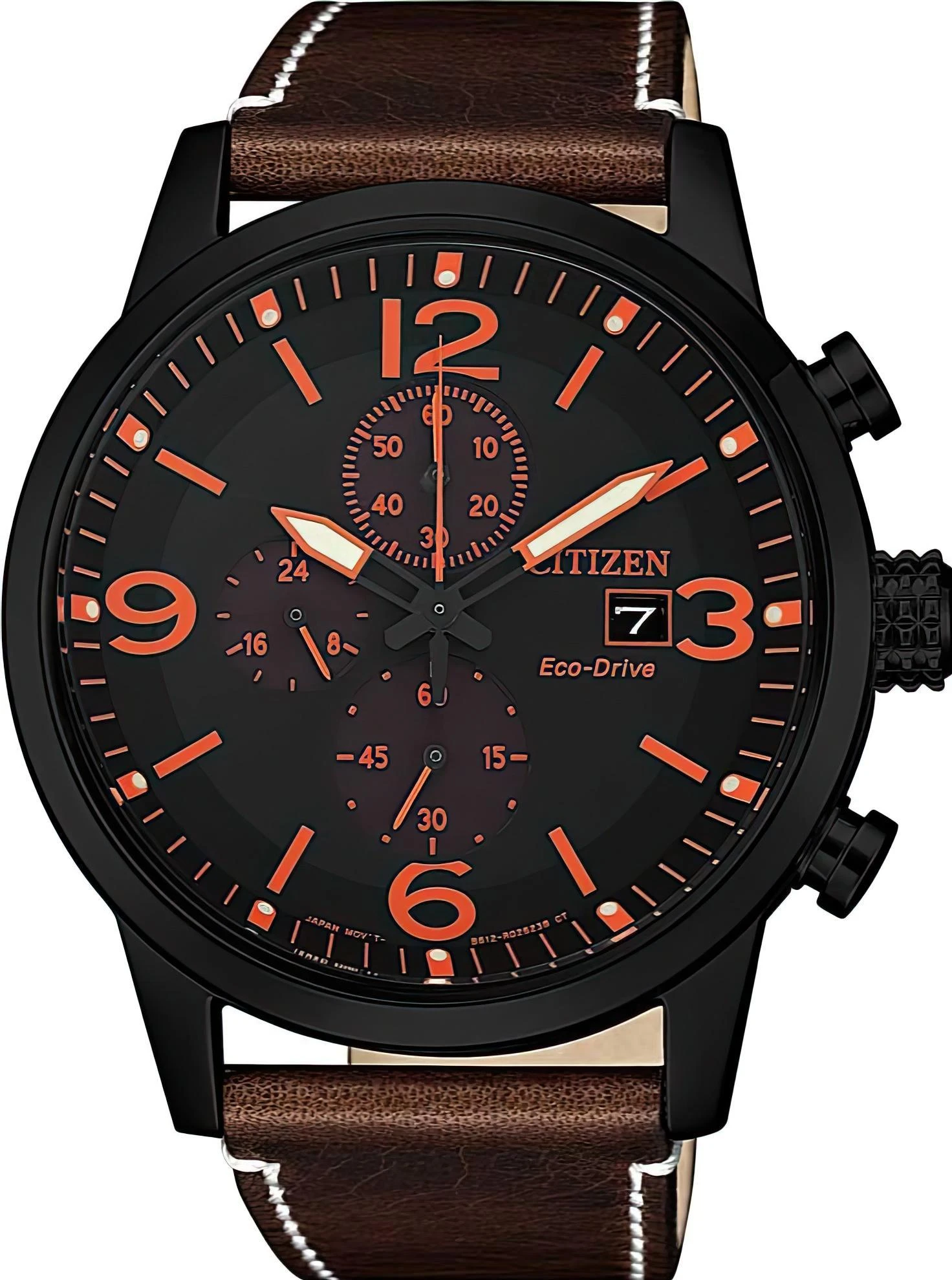 Мужские наручные часы Citizen Eco Drive CA0617-11E. Точный кварцевый механизм с аналоговой индикацией. Ремешок изготовлен из кожи. Функция хронографа. Солнечная батарейка. Солнечная подзаряжающаяся батарейка обеспечивает питание часов для работы. Отображение времени возможно в 12-часовом или 24-часовом формате. Браслет из нержавеющей стали. Прочное, устойчивое к царапинам минеральное стекло защищает часы от повреждений. На циферблате отображается текущее число месяца. Часы являются водонепроницаемыми до 10 Бар. Цвет циферблата: Черный. Цвет корпуса: Черный. На стрелки и отметки нанесен светонакопительный состав, благодаря этому считывать информацию с циферблата возможно и в темноте. Толщина: 11 мм. Гарантия: 2 года.