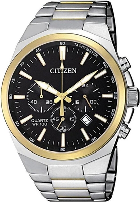 Мужские наручные часы Citizen Eco Drive AN8174-58E. Точный кварцевый механизм с аналоговой индикацией. Корпус изготовлен из высококачественной нержавеющей стали 316L с высокими антикоррозийными свойствами. На стрелки и отметки нанесен светонакопительный состав, благодаря этому считывать информацию с циферблата возможно и в темноте. На циферблате отображается текущее число месяца. Функция хронографа. Браслет из нержавеющей стали. Прочное, устойчивое к царапинам минеральное стекло защищает часы от повреждений. Часы являются водонепроницаемыми до 10 Бар. Цвет циферблата: Черный. Ширина (с заводной головкой): 40мм. Толщина: 11мм. Гарантия: 2 года.