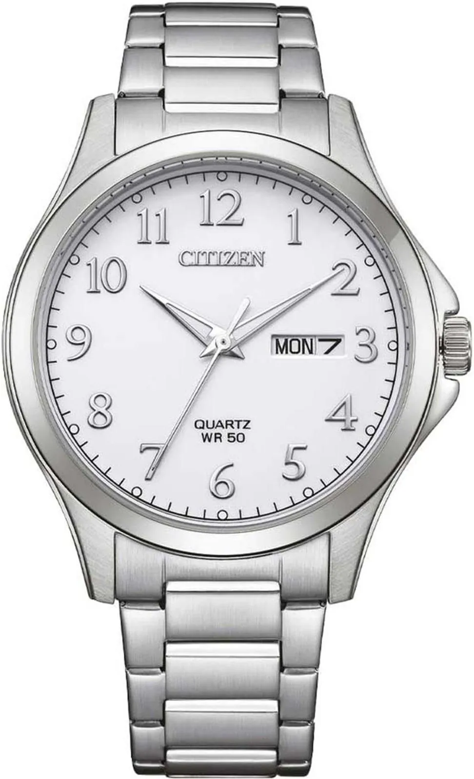 Кварцевые часы в стальном корпусе диаметром 41 мм со стальным браслетом. Модель с циферблатом, оснащенным цифровыми часовыми индексами, включает центральные часовую, минутную и секундную стрелки, а также индикацию даты и дня недели. Устойчивое к царапинам минеральное стекло обеспечивает защиту циферблата, а водостойкость WR50 позволяет носить часы во время мытья рук и под дождем.
