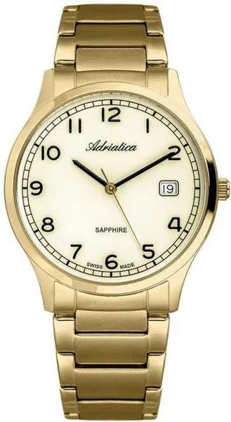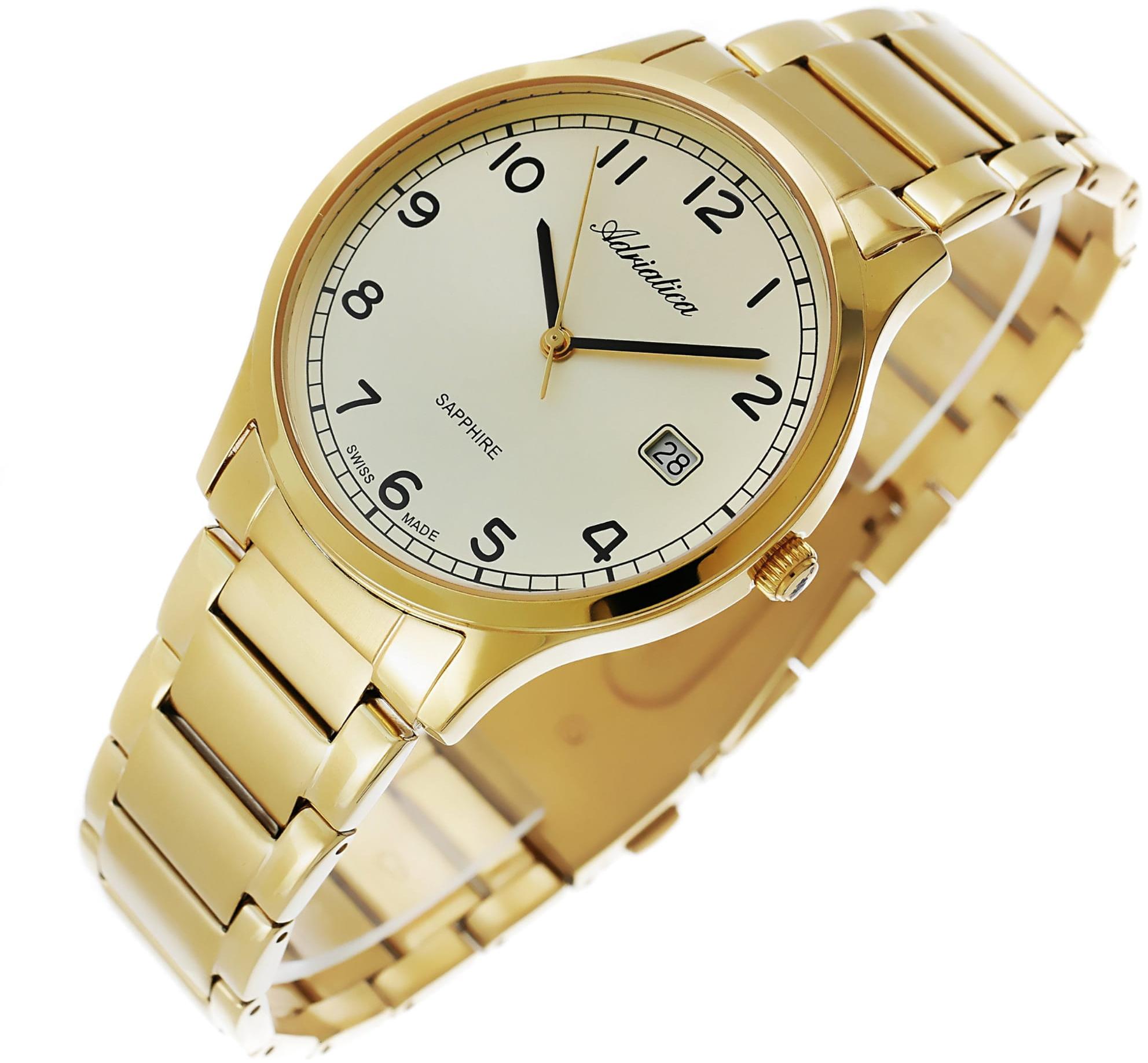 Швейцарские наручные часы для мужчин, выполненные в традиционном стиле. Круглый корпус и браслет из нержавеющей стали с PVD-покрытием цвета желтого золота. Кварцевый механизм.