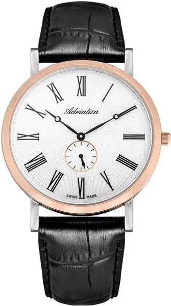 Наручные часы в стальном круглом корпусе, секундная стрелка вынесена на отдельный циферблат, на черном кожаном ремешке.