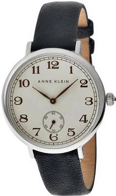 Женские кварцевые наручные часы круглой формы.Смещенная секундная стрелка.Цифры арабские, цвет циферблата белый, черный кожаный ремешок.