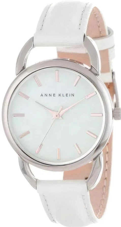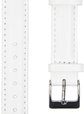 Женские наручные кварцевые часы в стальном корпусе круглой формы, секундная стрелка центральная, вместо цифр риски, на кожаном ремешке белого цвета.