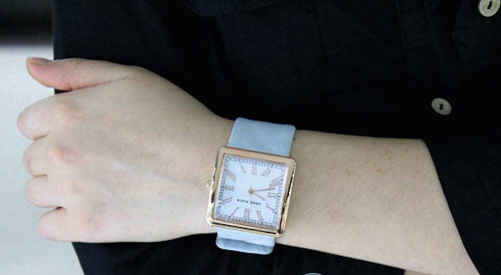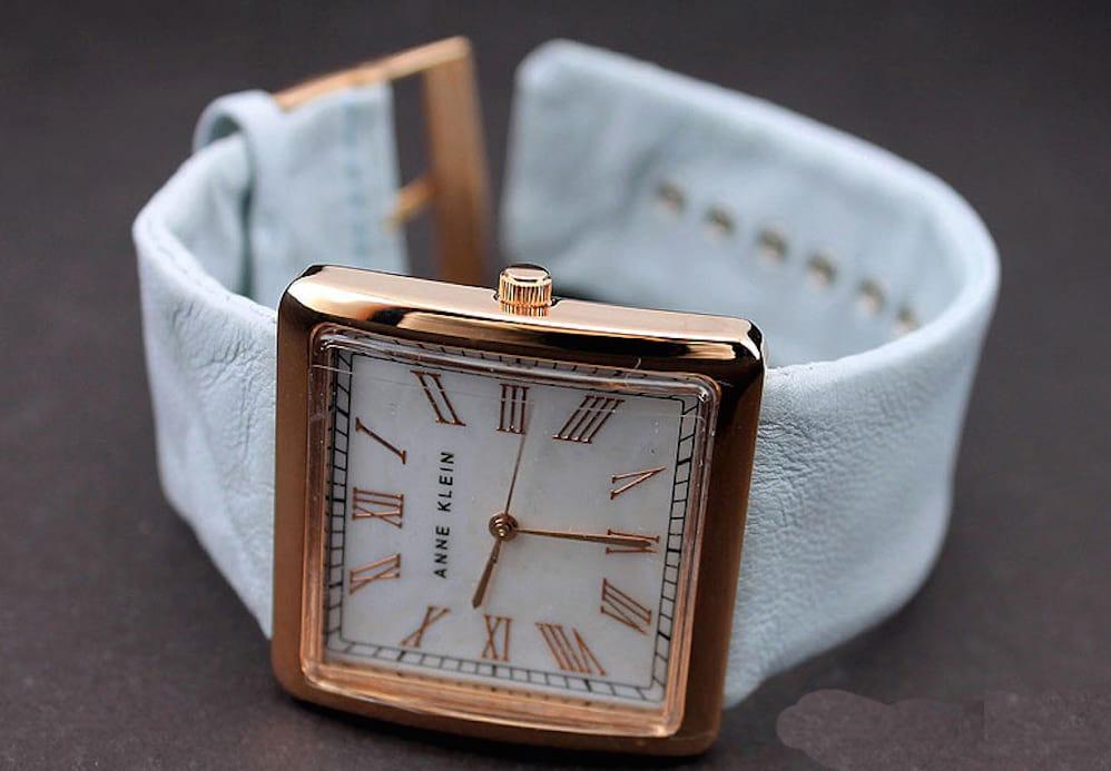 Женские наручные часы на ярком кожанм ремешке. Стальной прямоугольный корпус со стойким покрытием цвета золота. Аналоговый циферблат с аппликацией римских цифр.