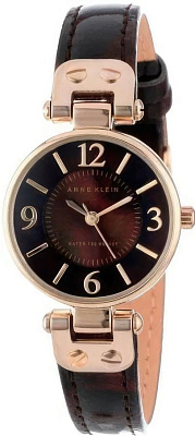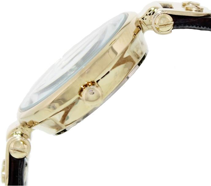 Женские наручные кварцевые часы в корпусе из латуни с PVD покрытием, стрелки и метки часа с PVD покрытием, на кожаном ремешке коричневого цвета.