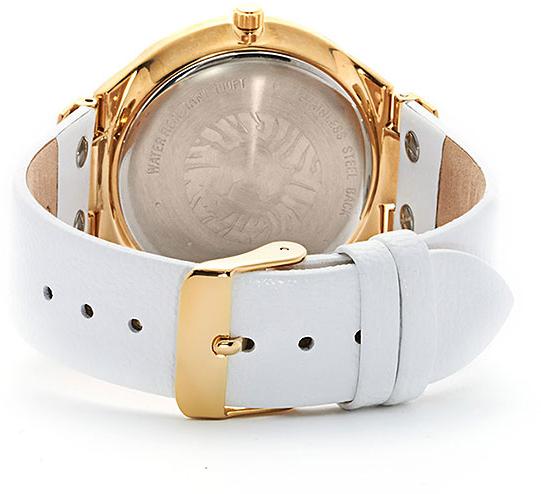 Женские наручные кварцевые часы выполненные из стального сплава со стойким покрытием под золото, на ремешке из кожи белого цвета. Минеральное стекло.Точный кварцевый механизм.