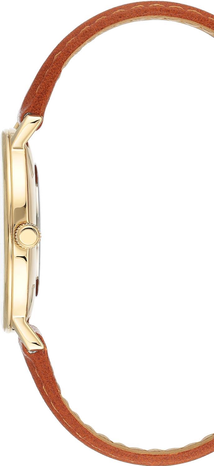 Точный кварцевый механизм. • Корпус: металл • Цвет корпуса: желтое золото • Ремень/браслет: натуральная кожа • Цвет браслета: коричневый • Цвет циферблата: белый • Водозащита: защита от брызг • Размер корпуса (мм): 34mm x 39mm