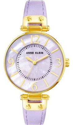Женские наручные часы Anne Klein Leather 9168LMLV. Точный кварцевый механизм с аналоговой индикацией. Ремешок изготовлен из кожи. Браслет из нержавеющей стали. Прочное, устойчивое к царапинам минеральное стекло защищает часы от повреждений. Часы являются водонепроницаемыми до 3 Бар. Цвет циферблата: Желтое золото. Цвет корпуса: Фиолетовый. Цвет корпуса: Перламутровый. Толщина: 10 мм. Гарантия: 2 года.