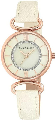 Наручные женские часы выполнены в классическом стиле. Корпус сделан из нержавеющей стали цвета розового золота. Циферблат перламутровый, кремовый, украшен камнями. Минеральное стекло. Ремешок из натуральной кожи, кремовый. Точный кварцевый механизм.