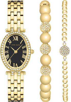 <b>Женские наручные часы Anne Klein Box Set 3970GBST</b>. Точный кварцевый механизм с аналоговой индикацией. Корпус изготовлен из высококачественной нержавеющей стали 316L с высокими антикоррозийными свойствами. Браслет из нержавеющей стали. Прочное, устойчивое к царапинам минеральное стекло защищает часы от повреждений. Часы являются водонепроницаемыми до 3 Бар. Цвет корпуса: Желтое золото. Цвет циферблата: Черный. Ширина (с заводной головкой): 28мм. Толщина: 7мм. Гарантия: 2 года.