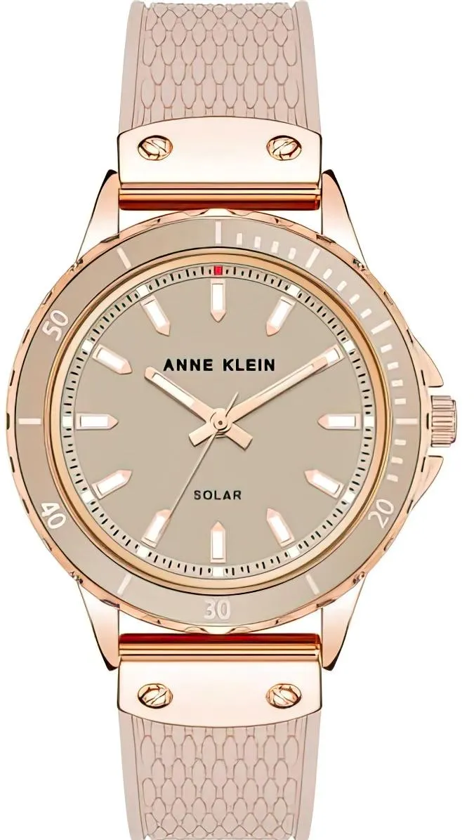 Женские наручные часы Anne Klein Plastic 3890RGBH. Точный кварцевый механизм с аналоговой индикацией. Полимерный ремешок. Натуральный полимерный материал является идеальным для изготовления ремешка благодаря своей чрезвычайной прочности и гибкости. Солнечная батарейка. Солнечная подзаряжающаяся батарейка обеспечивает питание часов для работы. Браслет из нержавеющей стали. Прочное, устойчивое к царапинам минеральное стекло защищает часы от повреждений. Часы являются водонепроницаемыми до 3 Бар. Цвет циферблата: Бежевый. Цвет циферблата: Розовое золото. Цвет корпуса: Бежевый. На стрелки и отметки нанесен светонакопительный состав, благодаря этому считывать информацию с циферблата возможно и в темноте. Толщина: 11 мм. Гарантия: 2 года.