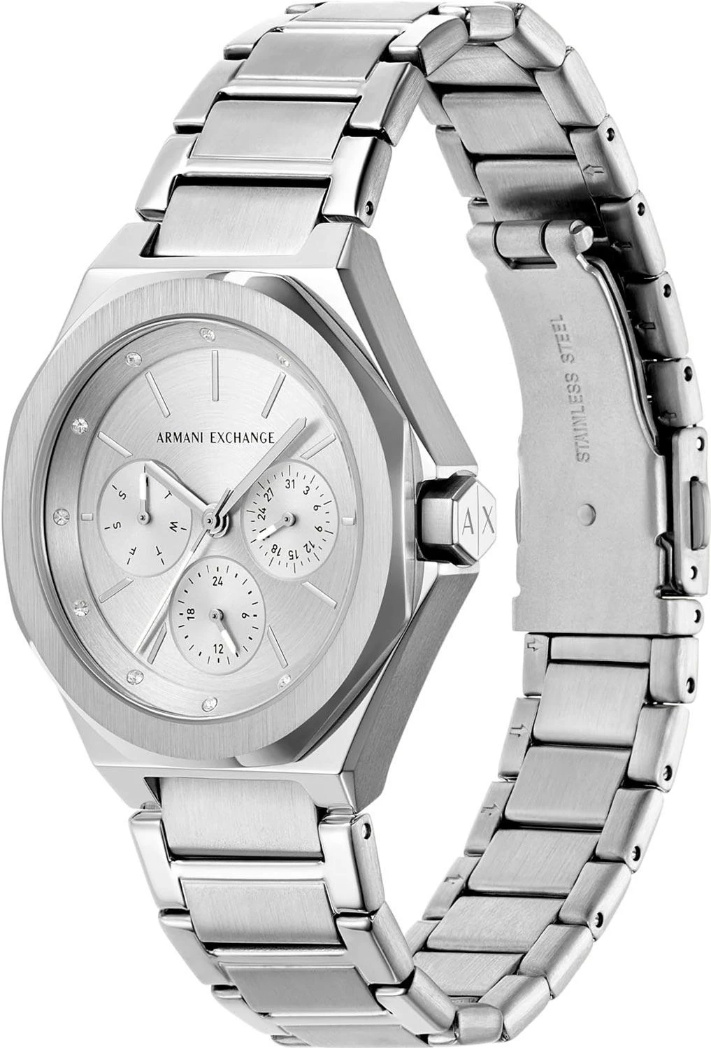 Женские наручные многофункциональные часы Andrea Multifunction. Круглый стальной корпус с полированной и сатинированной отделкой. 8-гранный декоративный безель. 12-ти и 24-х часовой формат времени. Циферблат выполнен по технологии Sunray (солнечные лучи) и украшен кристаллами. Метки в виде штрихов. Заостренные прямоугольные стрелки в стиле Baton. Дата, день недели и 24-часовая шкала вынесены на отдельные циферблаты. Граненая заводная головка с защитой. Стальной браслет с раскладывающейся застежкой. Водозащита 50 метров (5 АТМ/bar): выдерживают мытье рук, попадание крупных капель.