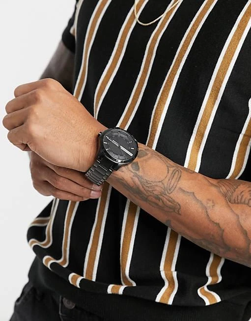 Мужские часы в свободном стиле. Современный динамичный дизайн. Круглый корпус и литой браслет из нерж. стали с IP-покрытием черного цвета. Минеральное стекло. Рельефный циферблат. Водостойкость 50 метров. Точный кварцевый механизм.