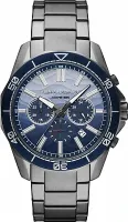 Мужские кварцевые часы-хронограф с секундомером. 12-ти и 24-х часовой формат времени. Стальной корпус. Безель с минутной шкалой. Текстурированный циферблат с метками в виде штрихов защищен минеральным стеклом. Стрелки и метки с люминесцентным покрытием, которое светится в темноте после непродолжительной зарядки на свету. Окошко даты находится между часовыми отметками 4 и 5. Гладкая заводная головка с защитой. Завинчивающаяся задняя крышка. Браслет с раскладывающейся застёжкой.