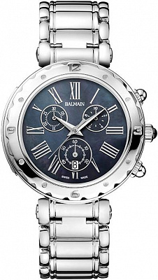Женские часы с современным дизайном. Чёрный перламутровый циферблат с тремя маленькими счётчиками (хронограф) и классическими римскими цифрами придаёт часам яркий штрих. Корпус из нержавеющей стали диаметром 38 мм и толщиной 11 мм. Эти часы швейцарского производства оснащены сапфировым стеклом.