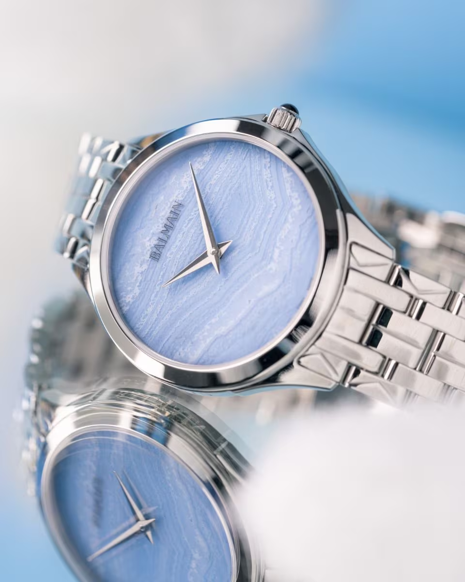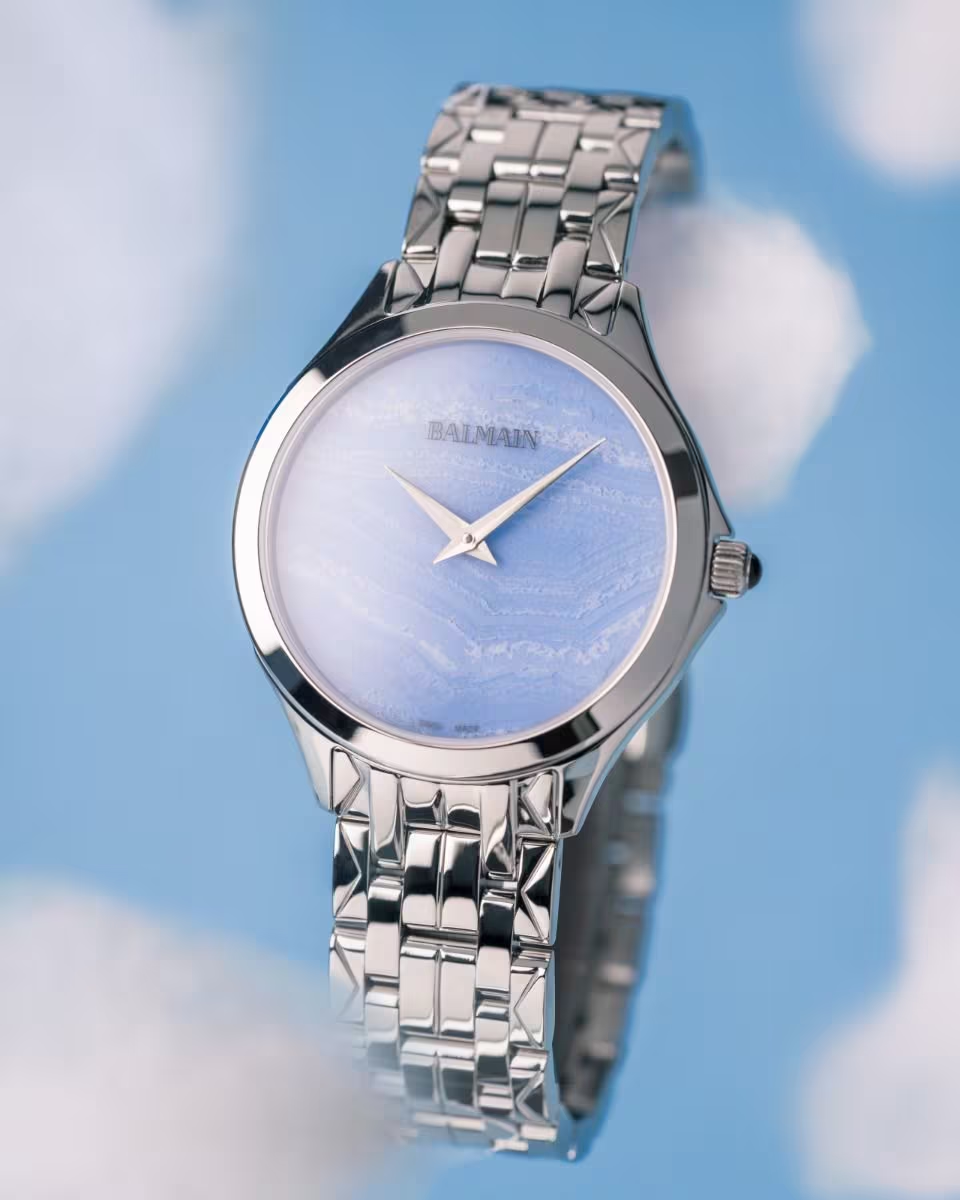 Balmain Flamea — это изысканные женские часы, выполненные в современном стиле, вдохновленном искусством парижской высокой моды. Циферблат из натурального камня, голубого кружевного агата, придает им уверенный акцент, а корпус из нержавеющей стали диаметром 34 мм и толщиной всего 6,35 мм в сочетании с браслетом из нержавеющей стали делает их идеальными на каждый день. Этот швейцарский аксессуар оснащен сапфировым стеклом.<br />