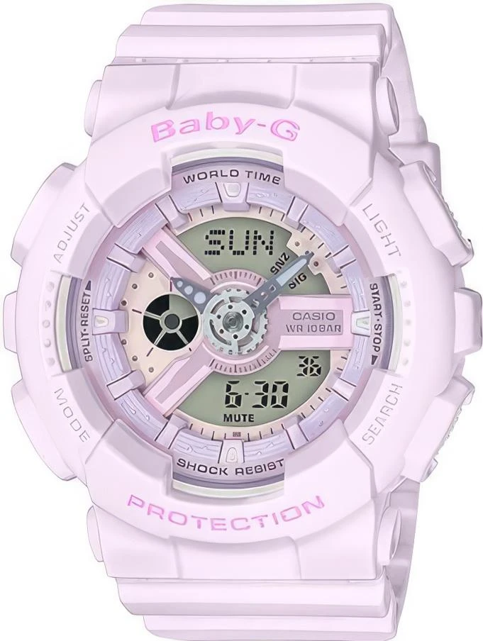 <b>Женские кварцевые часы из коллекции Baby-G</b><br><br>Точность хода: не хуже +/-30 секунд в месяц. • Электрическая подсветка - для освещения циферблата используется светодиод. • Отображение текущего времени в основных городах и регионах мира. • Секундомер с точностью показаний 1/100 сек и максимальным временем измерения - 24 час. • Таймер обратного осчета. • 5 ежедневных будильников. • Функция повтора сигнала будильника (Snooze). • Автоматический календарь. • Особая ударопрочная конструкция защищает от ударов и вибрации. Водозащита до 10 АТМ• Минеральное стекло устойчивое к возникновению царапин. • Ремешок из полимерного материала. • Точность хода: не хуже +/-30 секунд в месяц. • Срок службы батареи 2 года.Размер корпуса 46.3×43.4×15.8mm