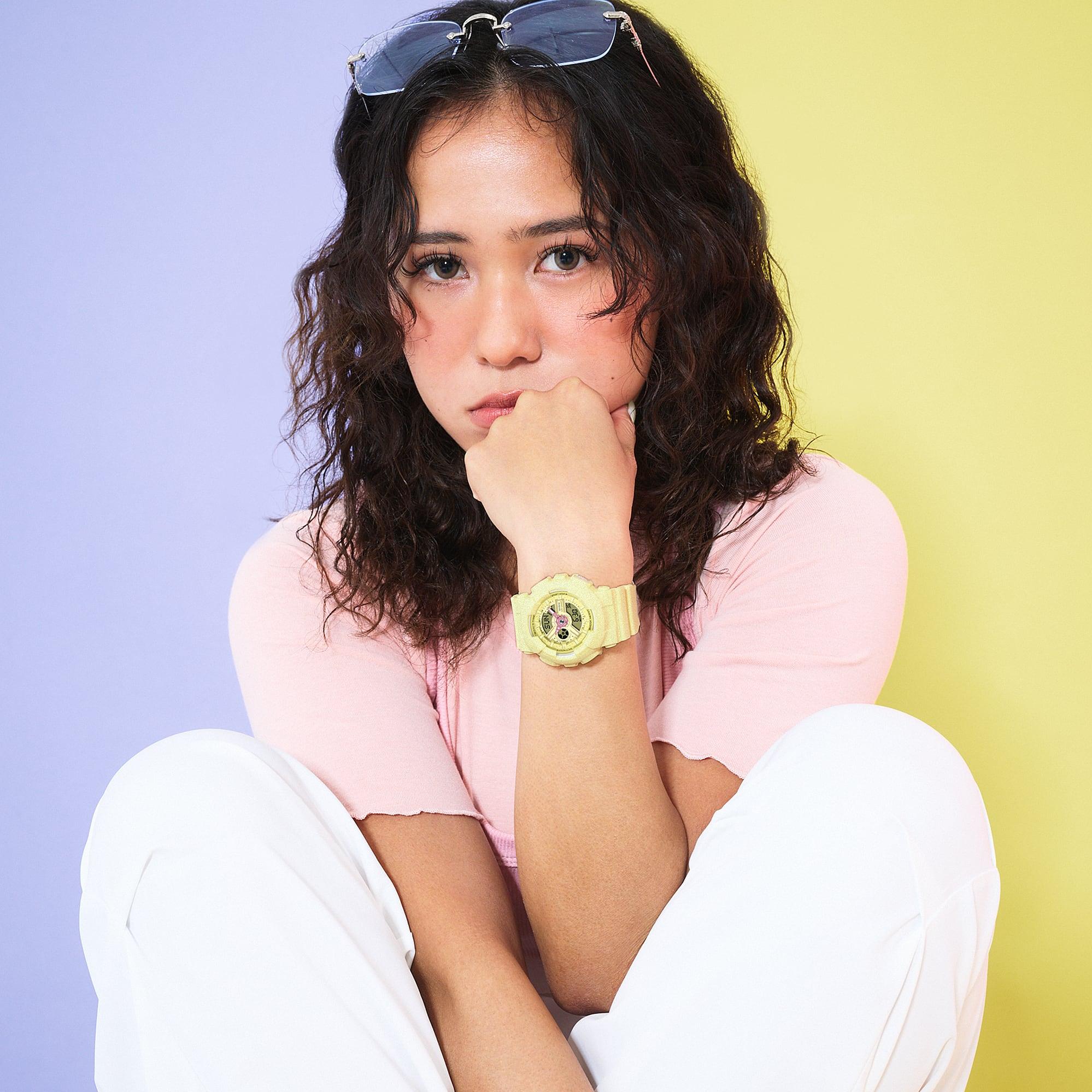 Женские кварцевые часы. Подсветка. Центральные часовая и минутная стрелки. Функция мирового времени - 29 часовых зон (48 городов). Секундомер с точностью 1/100 секунды и пределом измерения 24 часа. Таймер. 5 ежедневных будильника, один из них с функцией повтора будильника. Автоматический календарь. Ежечасный сигнал. 12/24х часовой формат времени. Включение/выключение звука кнопок. Желтый циферблат. Ударопрочный круглый корпус выполнен из полимерного материала желтого цвета. Размер корпуса составляет 43 х 46 х 16 мм. Ремешок выполнен из полимерного материала, стандартная застежка. Прочное минеральное стекло устойчивое к мелким механическим повреждениям. Водостойкость WR 100 (плавание без погружения).