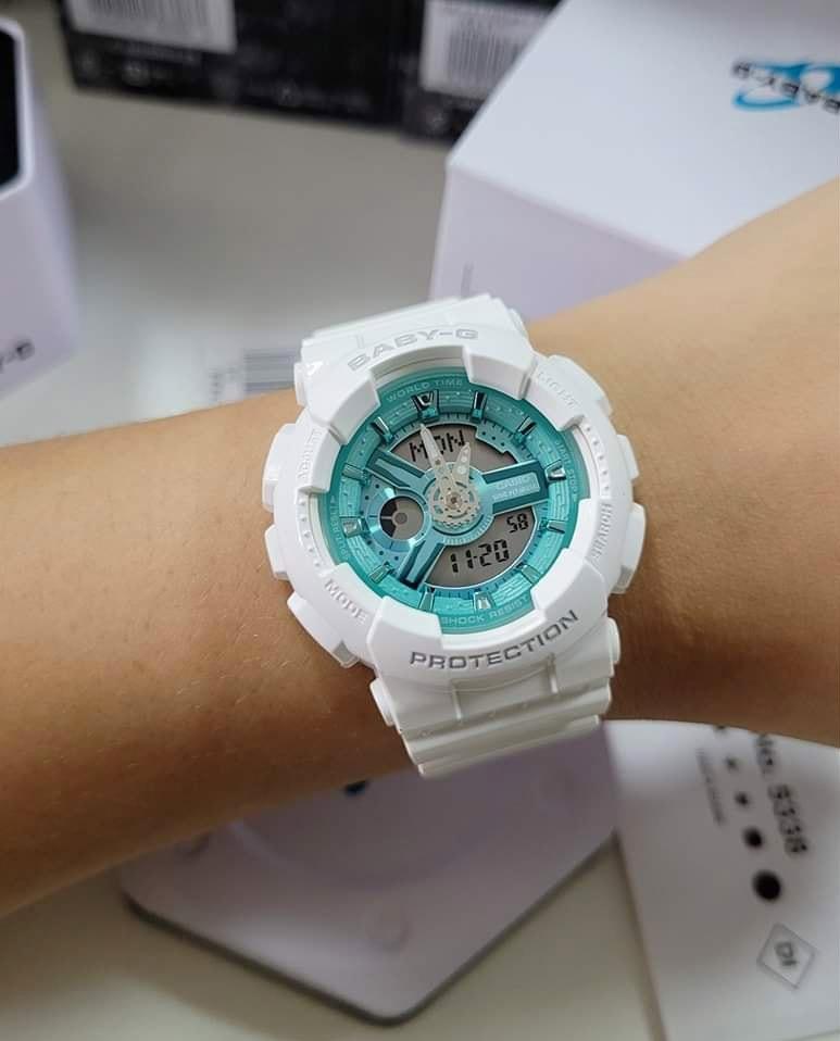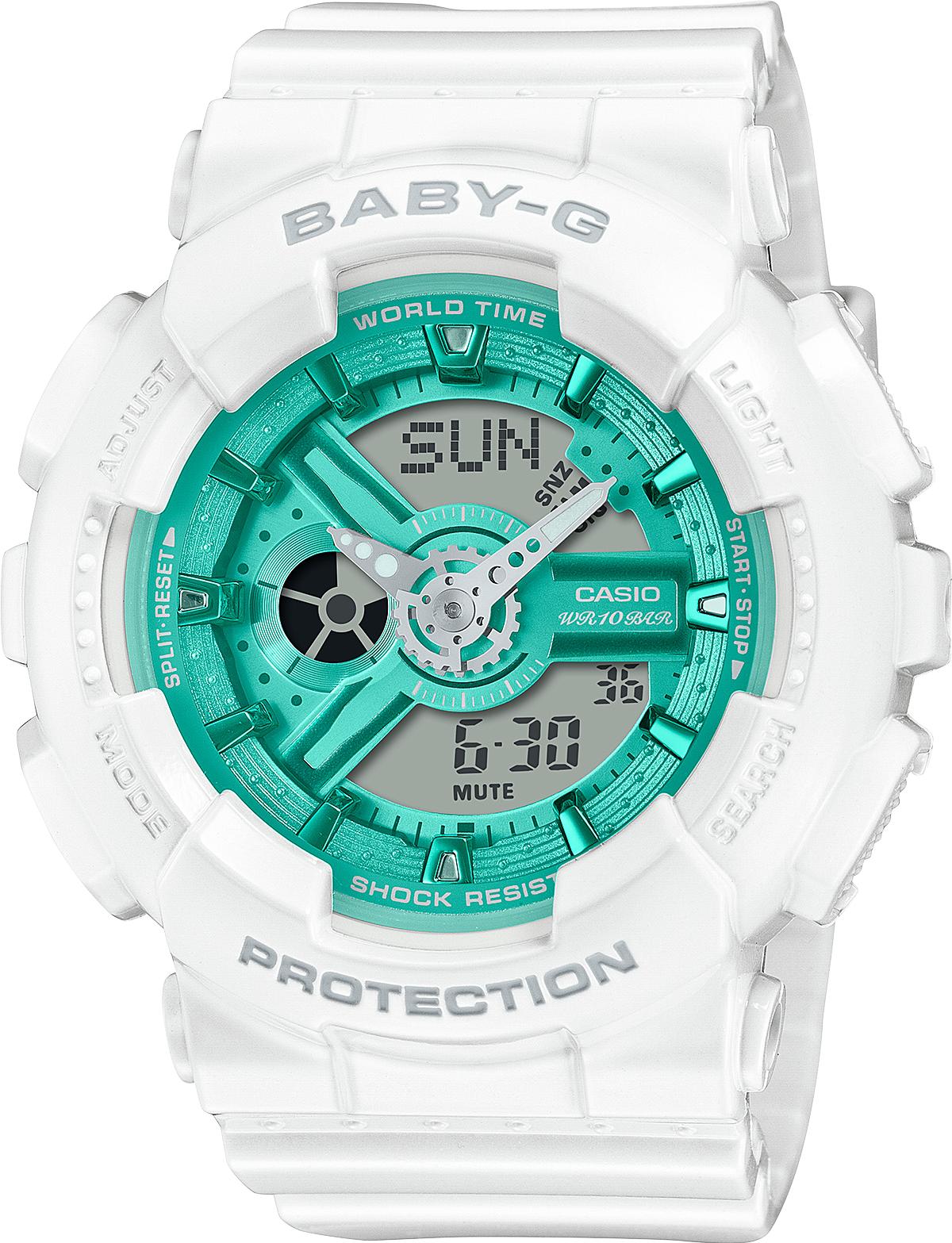 Женские наручные часы Casio Baby-G BA-110XWS-7A. Точный кварцевый механизм с аналого-цифровой индикацией. Полимерный корпус надежно защищает часы от механических повреждений. Светодиодная подсветка. Ударопрочная конструкция часов защищает от ударов и вибрации. Функция таймера. Таймеры обратного отсчета напомнят Вам о текущих или особенных событиях, издав звуковой сигнал в установленное время. Для подсветки дисплея используется светодиод, а так же имеет функцию автоматического включения подсветки, если Вы наклоните часы к своему лицу. Ежечасный сигнал. Функция будильника. После настройки автоматический календарь всегда отображает точную дату. Отображение времени возможно в 12-часовом или 24-часовом формате. Полимерный ремешок. Натуральный полимерный материал является идеальным для изготовления ремешка благодаря своей чрезвычайной прочности и гибкости. Прочное, устойчивое к царапинам минеральное стекло защищает часы от повреждений. Часы являются водонепроницаемыми до 10 Бар. Цвет корпуса: Белый. Цвет циферблата: Черный. Ширина (с заводной головкой): 43мм. Толщина: 16мм. Гарантия: 2 года.