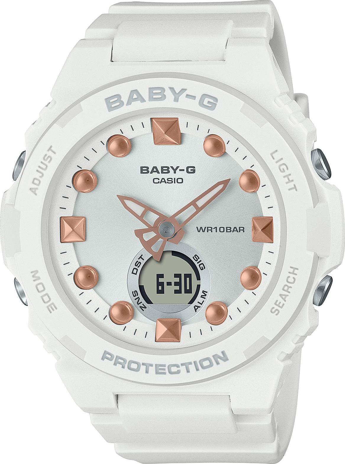 Женские наручные часы Casio Baby-G BGA-320-7A2. Точный кварцевый механизм с аналого-цифровой индикацией. Полимерный ремешок. Натуральный полимерный материал является идеальным для изготовления ремешка благодаря своей чрезвычайной прочности и гибкости. После настройки автоматический календарь всегда отображает точную дату. Аккумулятор обеспечивает часы достаточным питанием приблизительно на 3 года. Функция будильника. Функция хронографа. Отображение текущего времени в основных городах и конкретных областях по всему миру. Функция таймера. Таймеры обратного отсчета напомнят Вам о текущих или особенных событиях, издав звуковой сигнал в установленное время. Ударопрочная конструкция часов защищает от ударов и вибрации. Отображение времени возможно в 12-часовом или 24-часовом формате. Полимерный ремешок. Натуральный полимерный материал является идеальным для изготовления ремешка благодаря своей чрезвычайной прочности и гибкости. Прочное, устойчивое к царапинам минеральное стекло защищает часы от повреждений. На циферблате отображается текущее число, месяц и день недели. Часы являются водонепроницаемыми до 10 Бар. Цвет циферблата: Белый. Цвет корпуса: Белый. Цвет корпуса: Серый. Светодиодная подсветка. На стрелки и отметки нанесен светонакопительный состав, благодаря этому считывать информацию с циферблата возможно и в темноте. Толщина: 12 мм. Гарантия: 2 года.