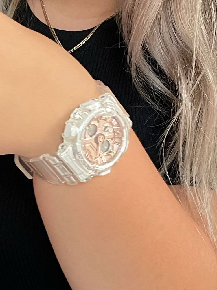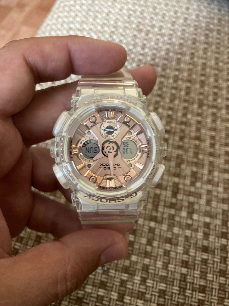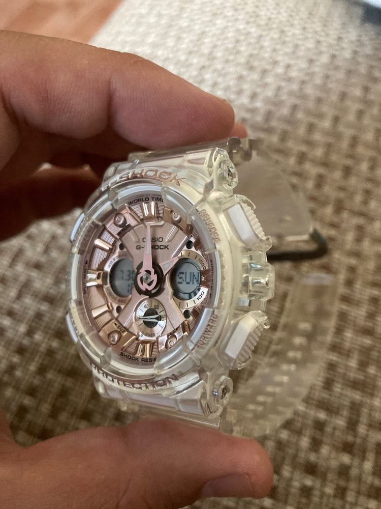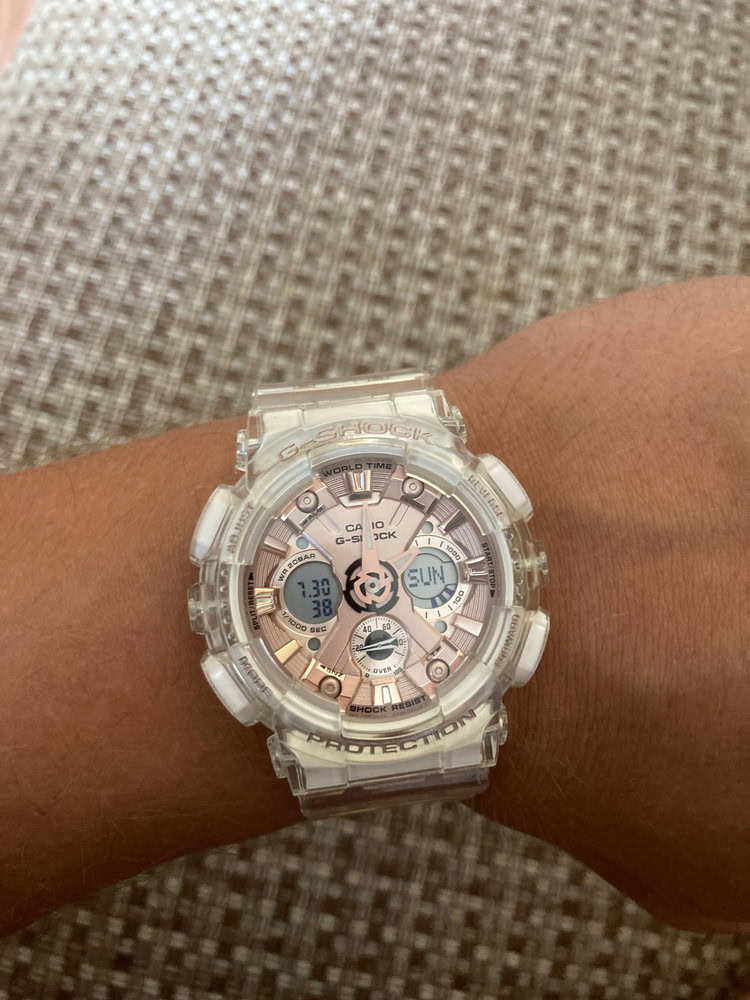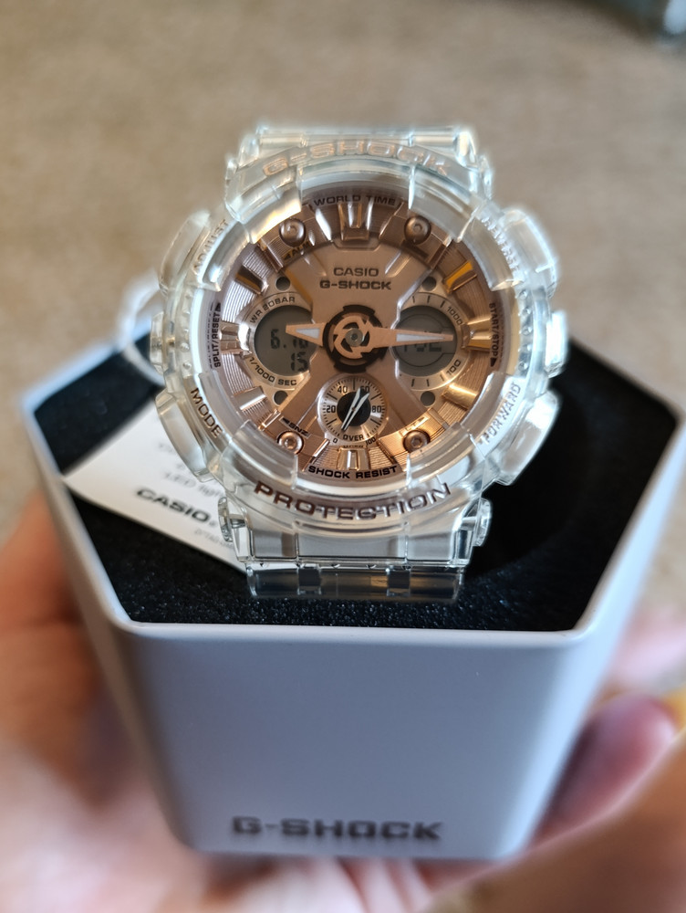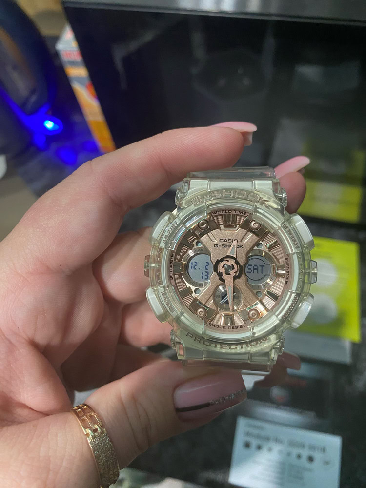 Ударопрочные часы из серии G-Shock S-Series с измененным дизайном, металлизированного циферблата. Многофункциональный кварцевый механизм с двойной цифро-аналоговой индикацией. Секундомер с точностью 1/1000 сек. на 100 часов измерений.