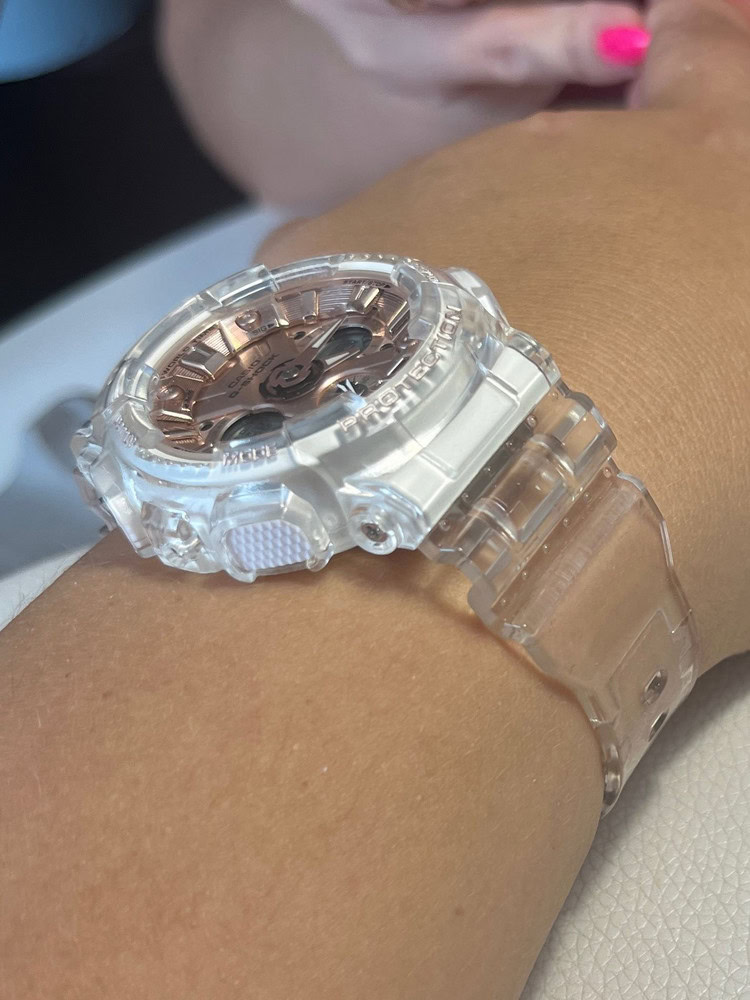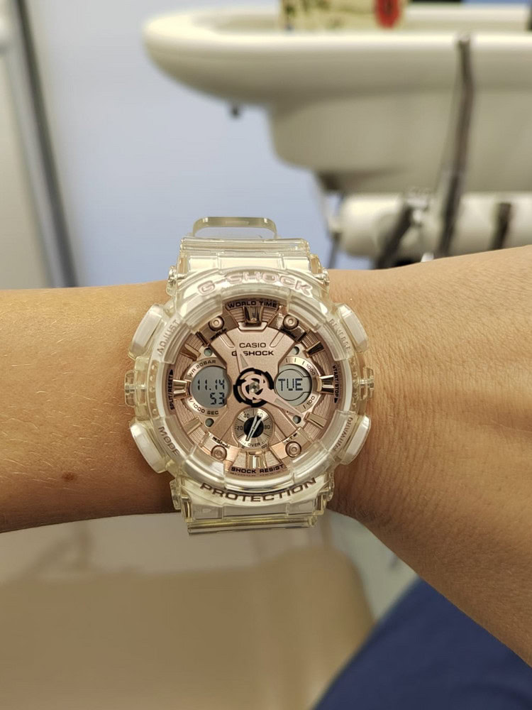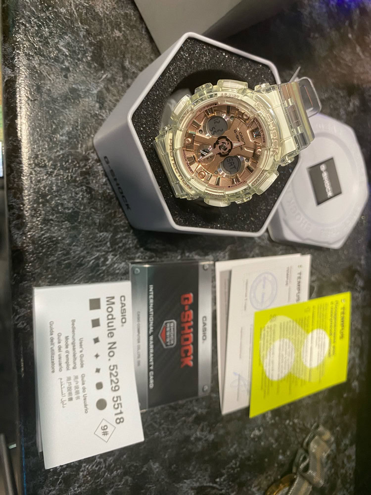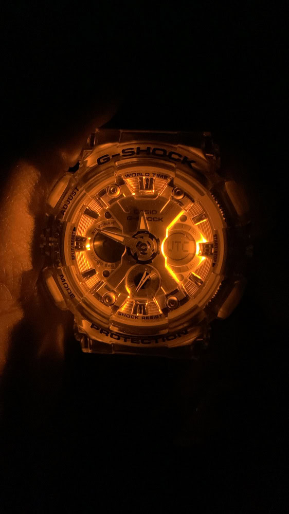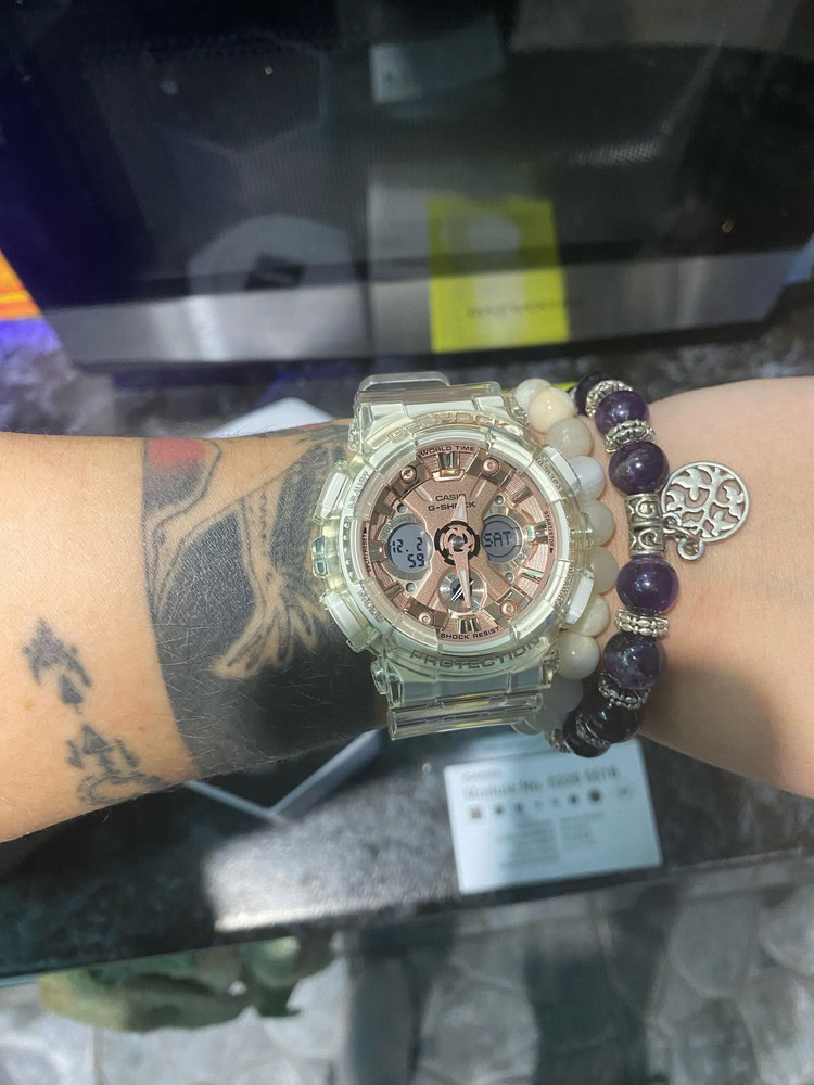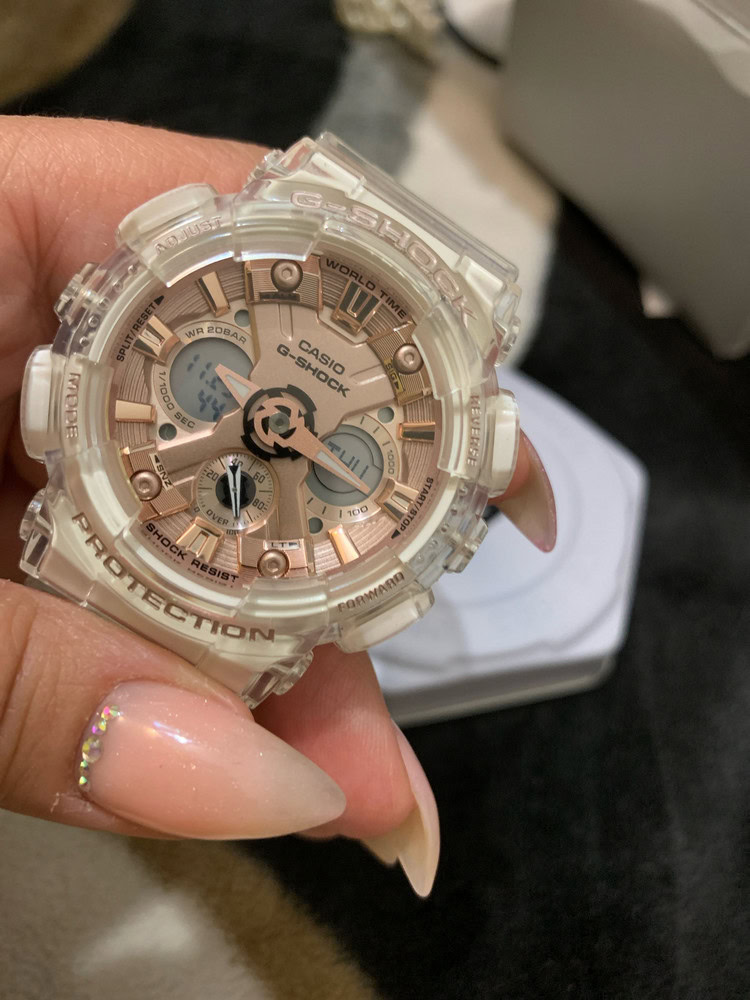 Ударопрочные часы из серии G-Shock S-Series с измененным дизайном, металлизированного циферблата. Многофункциональный кварцевый механизм с двойной цифро-аналоговой индикацией. Секундомер с точностью 1/1000 сек. на 100 часов измерений.