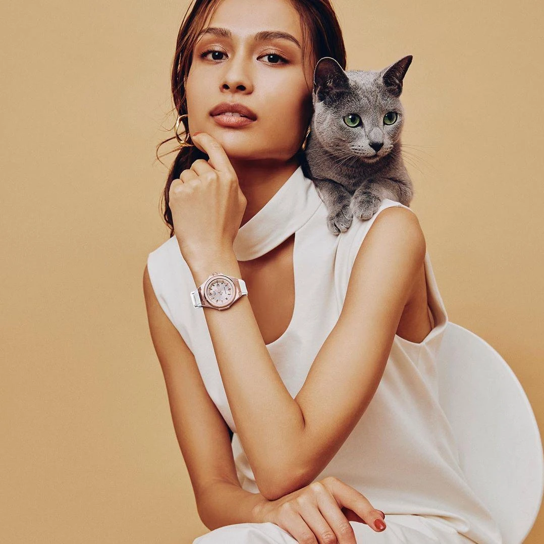 Женские кварцевые часы на солнечной батарее из серии G-MS. Круглый ударопрочный комбинированный корпус из пластика и стали с покрытием цвета золота. Серебристый циферблат. Минеральное стекло. Пластиковый ремешок. Простая пряжка. Водозащита 100 м.