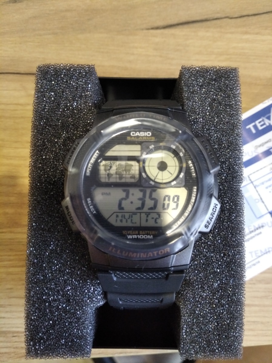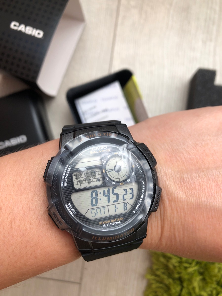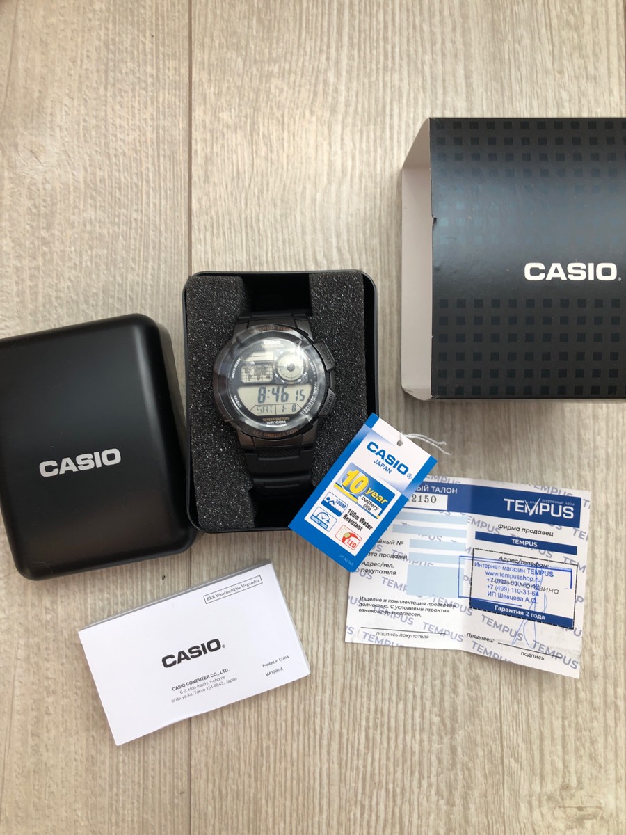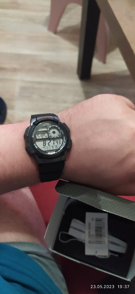 Часы пришли в пластмассовом футляре. Внутри, помимо часов индивидуальная бирка со штрихкодом, инструкция и гарантийный талон. Товар качественный, собирают в Китае, сам механизм - Япония. В данных часах 2 циферблата отображения времени - цифровой и маленький аналоговый, плюс карта мира с нанесением и возможностью выбора часовых поясов. Подсветка классическая оранжевая. Заказывал сыну подростку - он в восторге. У самого две модели Casio - классические со стрелками и электронные, ношу и радуюсь, очень практичные часы. Воды не боятся - плавал в речке, бассейне и под душем.