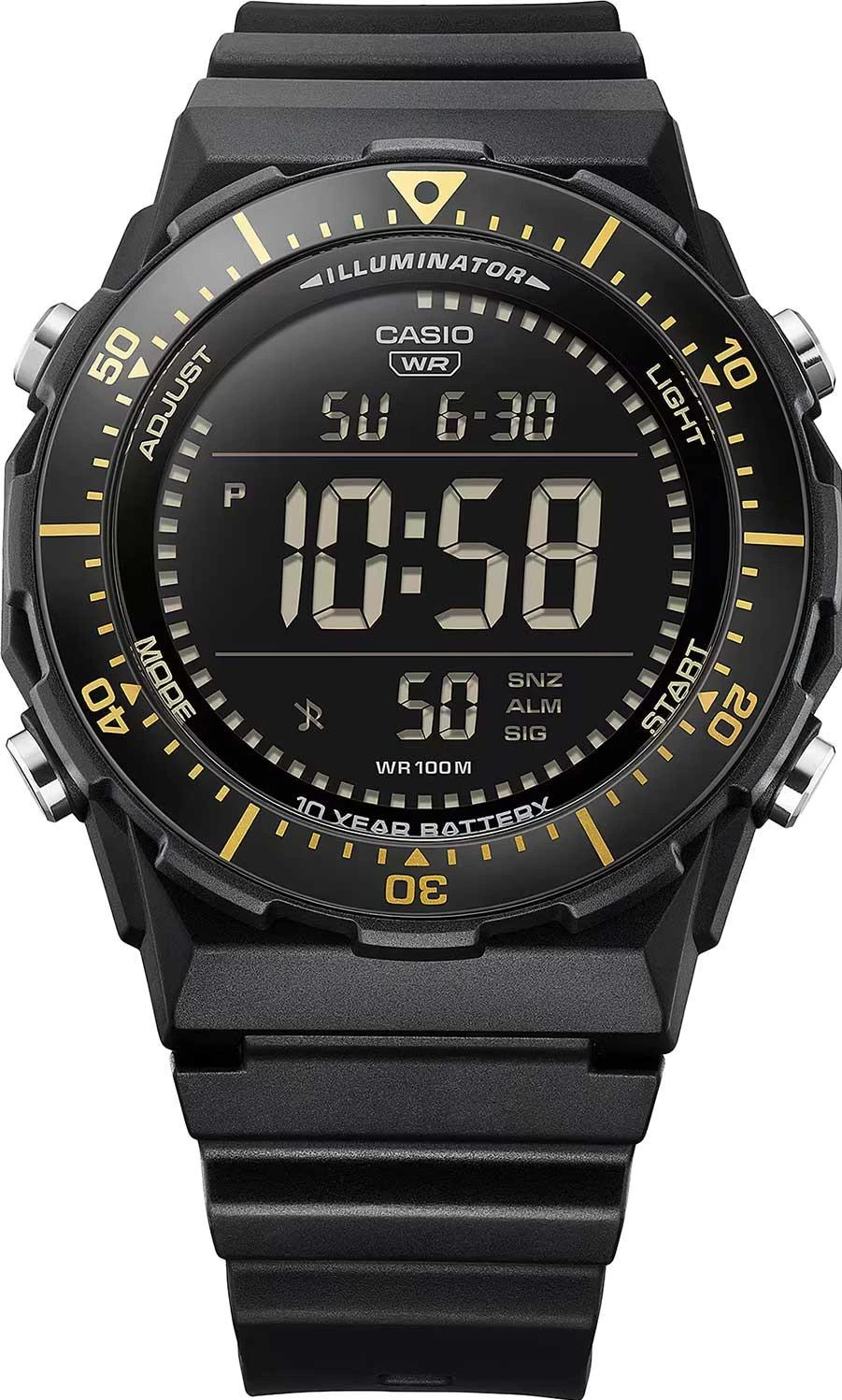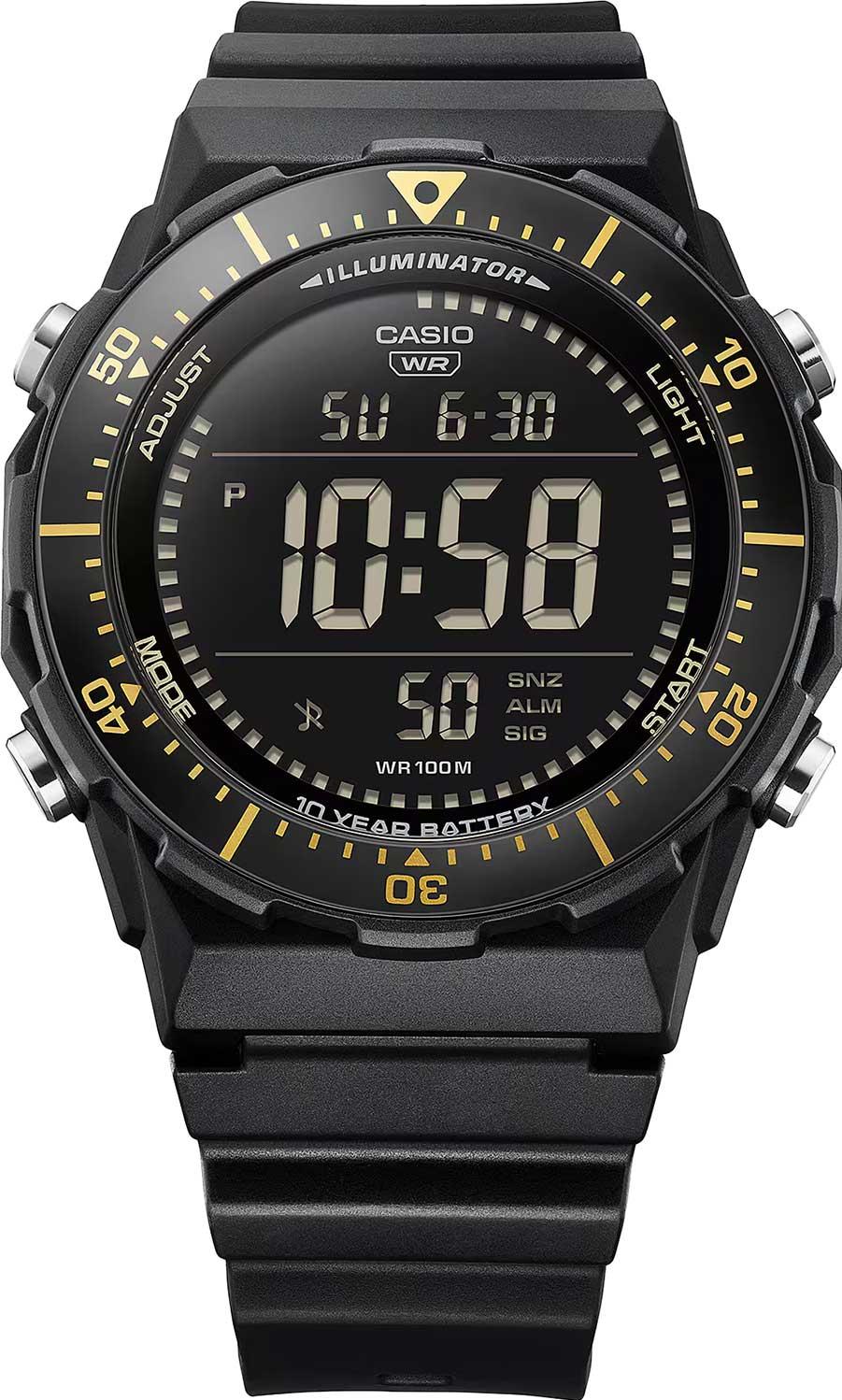Многофункциональные цифровые часы с широким, легко читаемым дисплеем и вращающимся безелем — идеально подходят для занятий спортом. Standard Digital. Мужские часы. Циферблат подсвечивается светодиодом. Настраиваемое послесвечение 1,5 или 3сек. Цвет подсветки: оранжевый. Второй часовой пояс. Включение/выключение летнего времени. 12-ти и 24-х часовой формат времени. Секундомер с точностью показаний 1/100с и временем измерения 24ч. SPLIT-хронограф. Таймер обратного отсчета от 1мин до 24ч с автоповтором. Вращающийся безель с алюминиевой вставкой. Функция отключения/включения звука кнопок. Индикатор рыбалки — определяет время, наиболее подходящего для рыбалки. Задняя крышка крепится на 4-х винтах. Батарея рассчитана на 10 лет. Ремешок с классической застежкой.