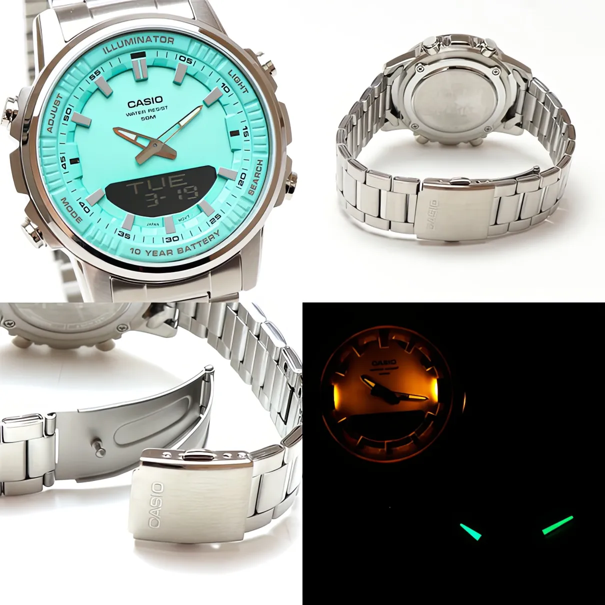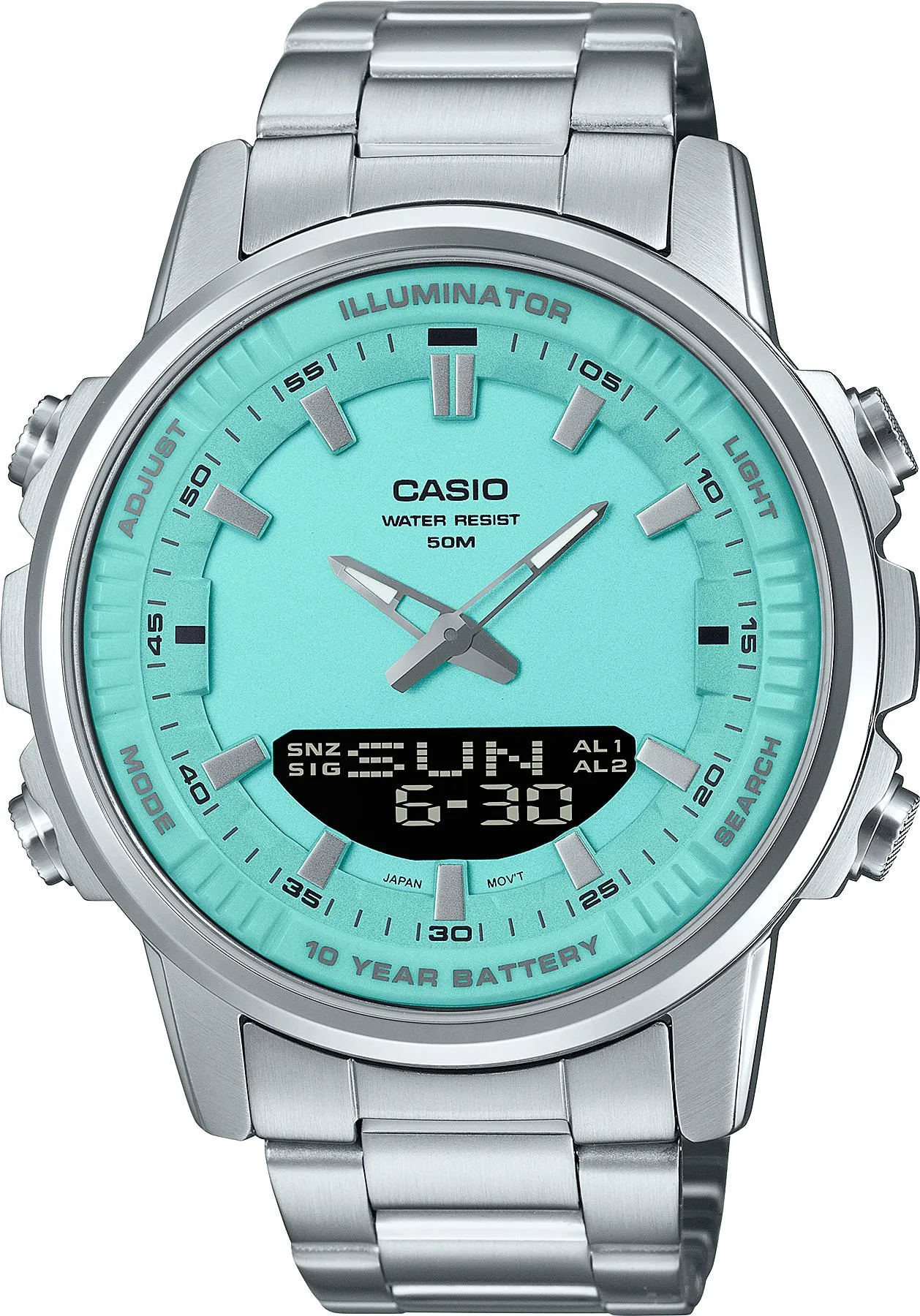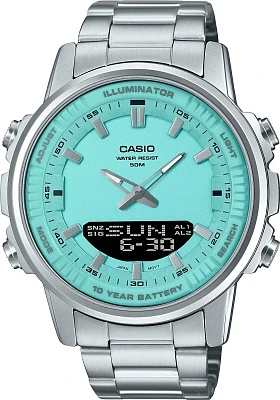 Мужские наручные часы Casio Collection AMW-880D-2A2. Точный кварцевый механизм с аналого-цифровой индикацией. Браслет из нержавеющей стали. После настройки автоматический календарь всегда отображает точную дату. Для подсветки дисплея используется светодиод, а так же имеет функцию автоматического включения подсветки, если Вы наклоните часы к своему лицу. Функция будильника. Ежечасный сигнал. Функция хронографа. Отображение текущего времени в основных городах и конкретных областях по всему миру. Функция перемещения стрелок. Нажатие на кнопку обеспечит перемещение стрелок в такое положение, которое позволит Вам легко считать информацию с маленьких цифровых дисплеев – например, дату или показатели секундомера. Функция таймера. Таймеры обратного отсчета напомнят Вам о текущих или особенных событиях, издав звуковой сигнал в установленное время. Отображение времени возможно в 12-часовом или 24-часовом формате. Браслет из нержавеющей стали. Прочное, устойчивое к царапинам минеральное стекло защищает часы от повреждений. На циферблате отображается текущее число, месяц и день недели. Часы являются водонепроницаемыми до 5 Бар. Цвет циферблата: Серебристый. Цвет корпуса: Голубой. Светодиодная подсветка. Высота (с ушками): 52 мм. Толщина: 12 мм. Гарантия: 2 года.