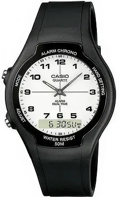 Мужские наручные цифро-аналоговые часы на пластиковом ремешке черного цвета. Часовые индексы: штрихи и арабские цифры синего цвета.