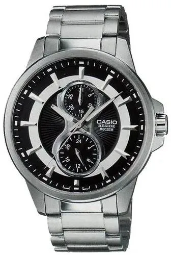 Мужские наручные часы Casio Collection BEM-304D-1A. Точный кварцевый механизм с аналоговой индикацией. Корпус изготовлен из высококачественной нержавеющей стали 316L с высокими антикоррозийными свойствами. На стрелки и отметки нанесен светонакопительный состав, благодаря этому считывать информацию с циферблата возможно и в темноте. На циферблате отображается текущее число месяца. Браслет из нержавеющей стали. Прочное, устойчивое к царапинам минеральное стекло защищает часы от повреждений. Часы являются водонепроницаемыми до 5 Бар. Ширина (с заводной головкой): 49мм. Толщина: 10мм. Гарантия: 2 года.