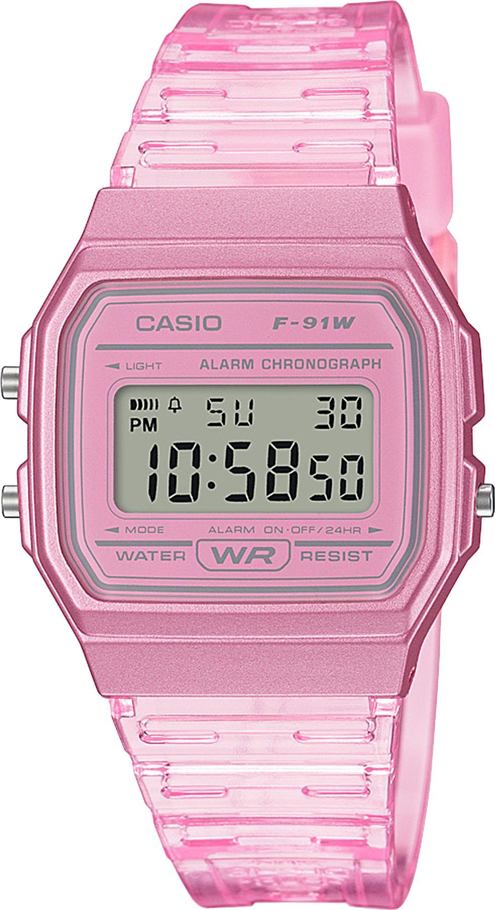 Женские наручные часы Casio F-91WS-4E. Простые и удобные в использовании часы на каждый день. Яркая модель с полупрозрачным ремешком. Циферблат подсвечивается светодиодом. Цвет подсветки: зеленый. 12-ти и 24-х часовой формат времени. Секундомер с точностью показаний 1/100с и временем измерения 1ч. Секундомер с функцией SPLIT. Ежедневный будильник. Ежечасный сигнал. Автоматический календарь (установлено 28 дней на февраль). Точность: ±30 секунд в месяц. Примерное время работы от батареи: 7 лет на батарейке CR2016 Стальная задняя крышка крепится на 4-х винтах. Ремешок из полимерного материала с классической застежкой.