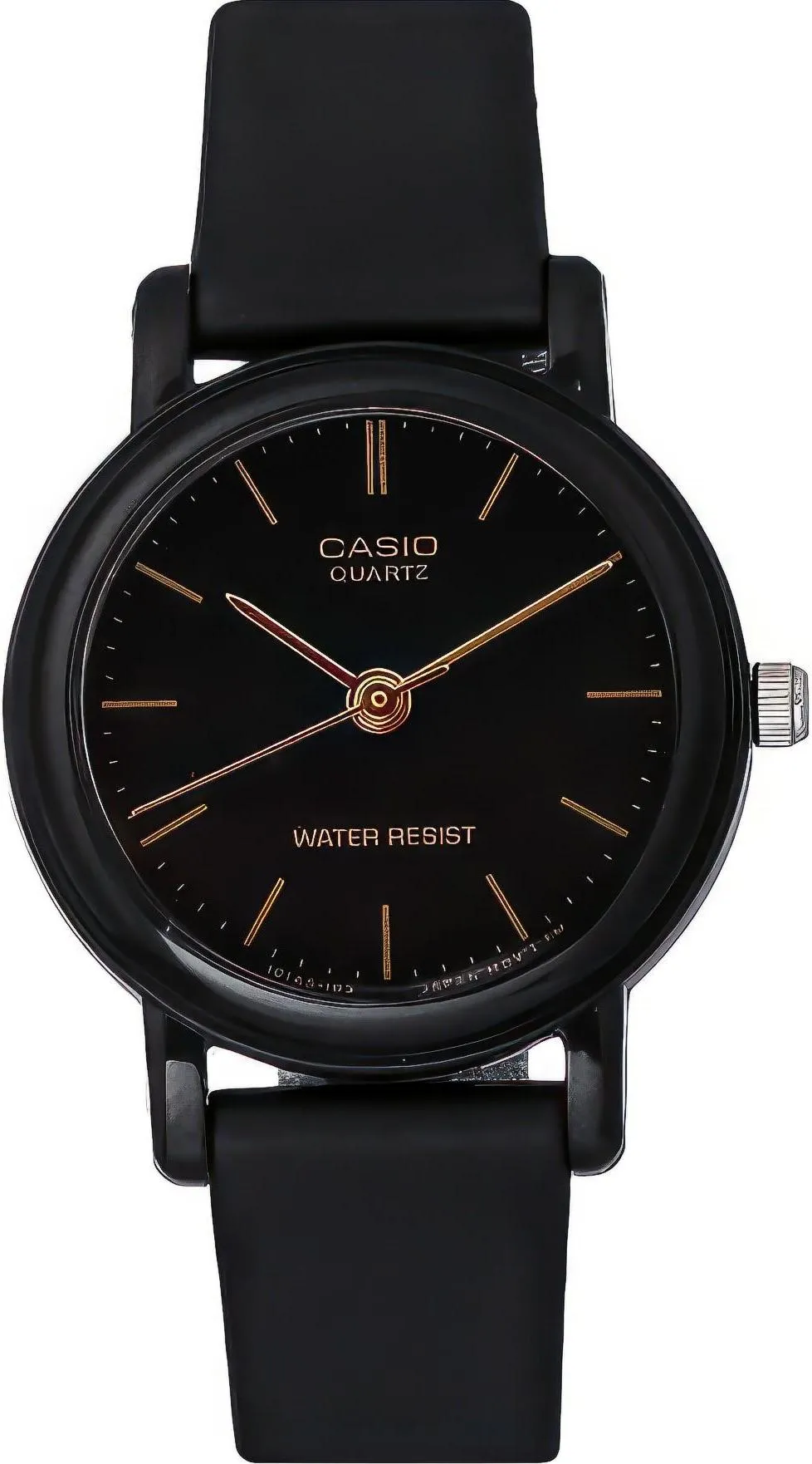 Наручные часы с кварцевым механизмом, на черном ремешке из каучука и черным циферблатом.