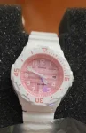 Крупные белые женские наручные часы с кварцевым механизмом. Часы в пластиковом корпусе на силиконовом ремешке. Циферблат белого цвета с крупными маркерами и стрелками.