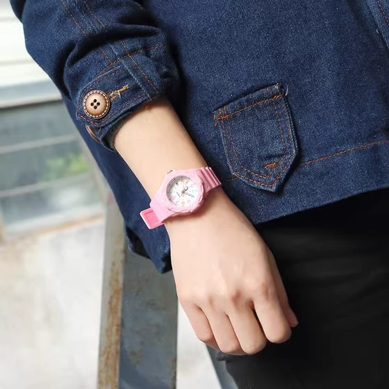Крупные белые женские наручные часы с кварцевым механизмом. Часы в пластиковом корпусе на силиконовом ремешке. Циферблат белого цвета с крупными маркерами и стрелками.