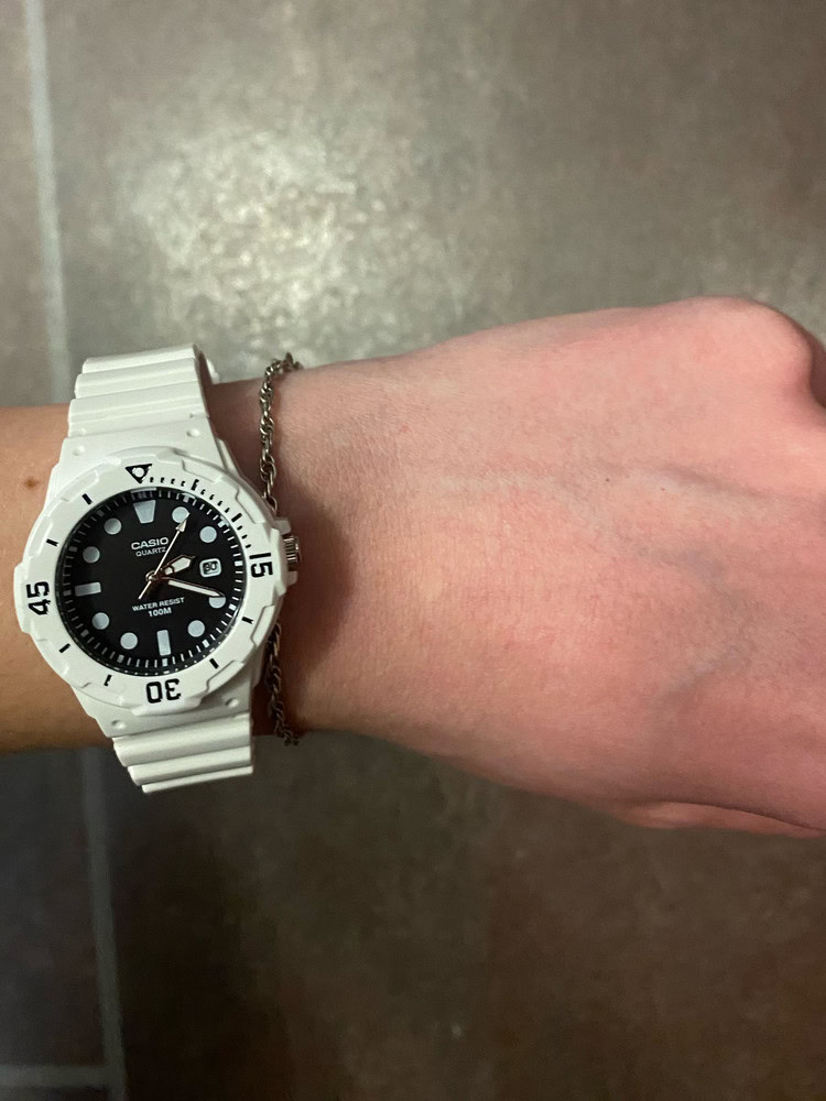 Отличные часики,ношу не снимая! Только перед душем снимаю! В воде проверены. Коробочка,гарантийный талон был на месте. Запястье 17см на предпоследнюю дырочку застегиваю. Хотелось ремешок чучуть последнее т.к. постоянно вылезает из шлевки!