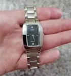 Женские стильные часы с современным дизайном для деловых встреч и свободного образа жизни. Есть парные мужские модели. Прямоугольный корпус из металла и стальной браслет, возможно IP-покрытие. Выпуклое минеральное стекло. Точный кварцевый механизм.