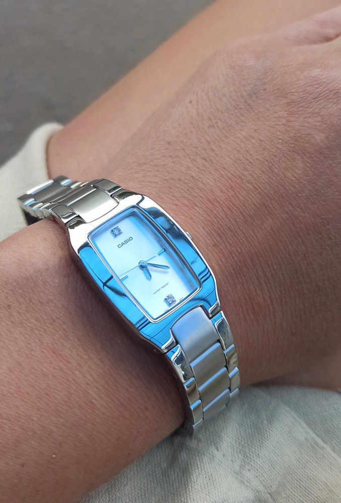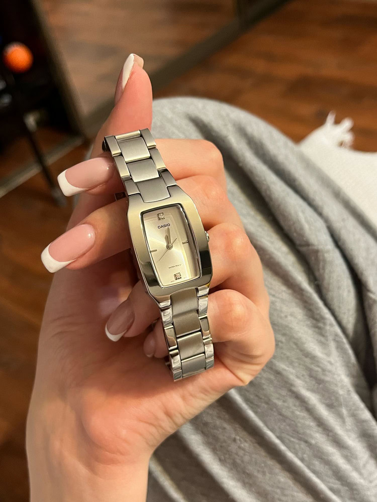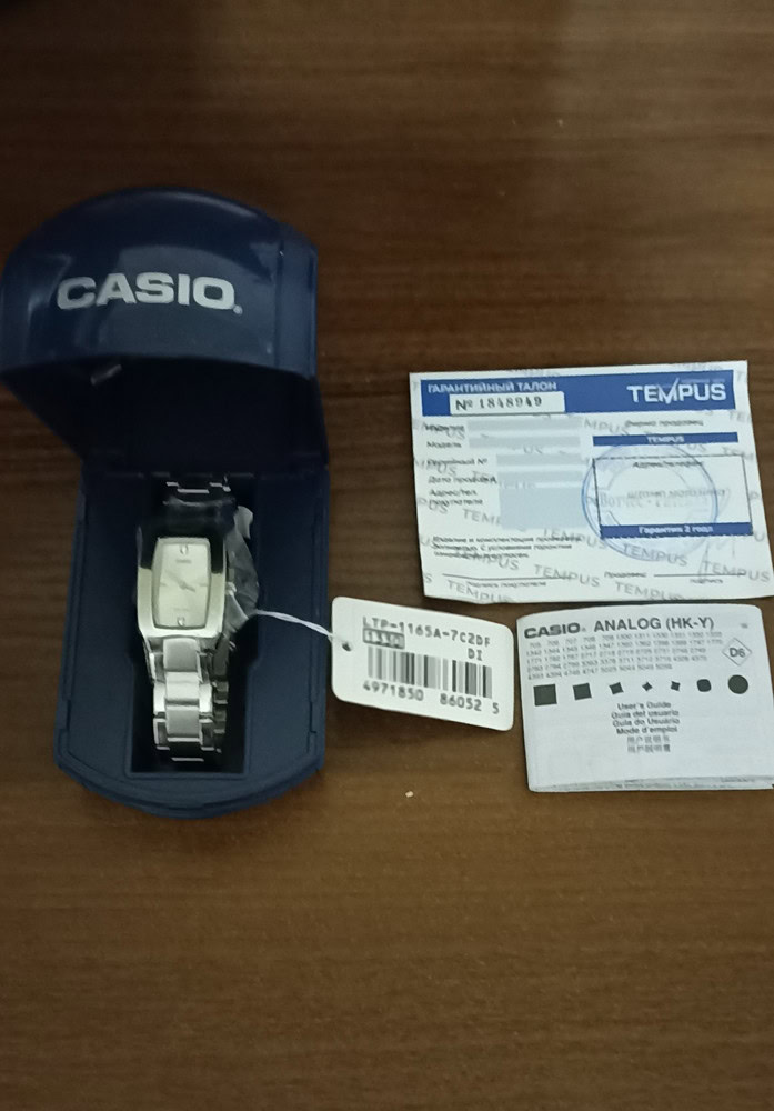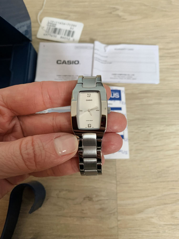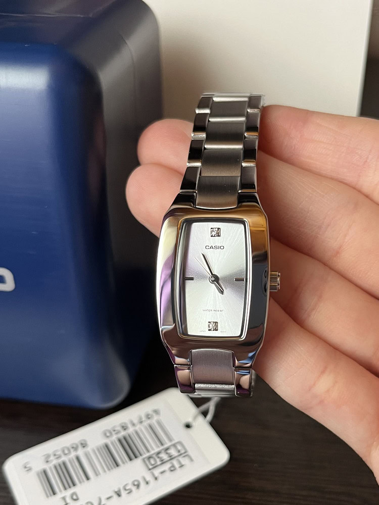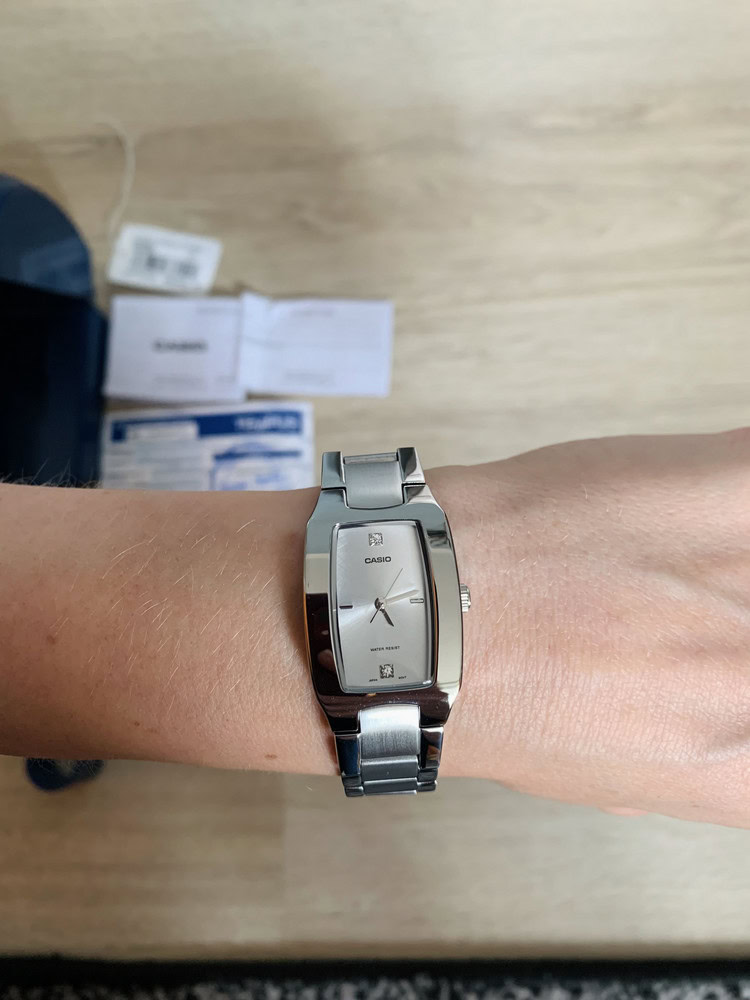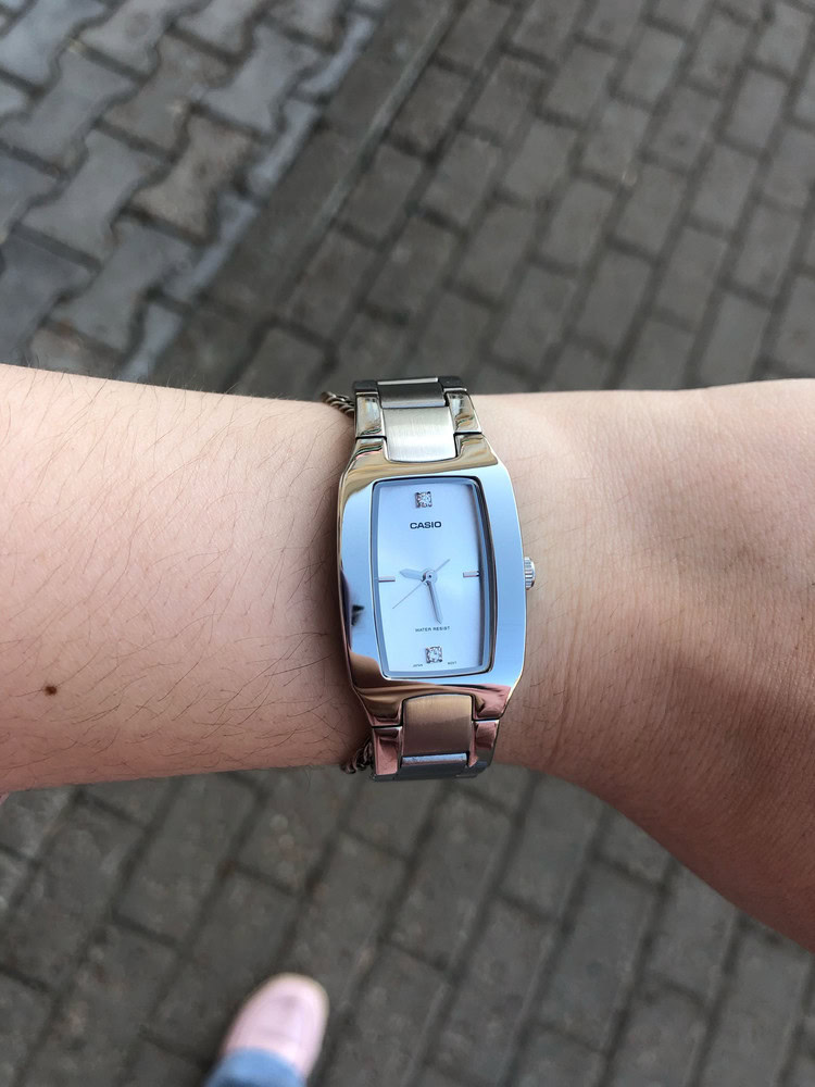 Часы очень хорошие и красивые. Нужна была именно такая форма - прямоугольная. Рассматривала изначально Швейцарию, но не могла найти такую форму, да и цены значительно выше. Бренд Casio попался на глаза случайно, стала искать в нём. Марка давно известна и имеет хорошую репутацию, насколько я знаю, так что в покупке не сомневалась. Цена просто смешная, а носить не стыдно! Обожаю такие покупки). У меня анормально тонкое запястье, будем убирать 3 звена из браслета. Также, Надеюсь, гарантийный талон будет действовать в случае чего, к сожалению, сотрудник пункта выдачи не указал в нём дату покупки, но она зафиксирована в личном кабинете.