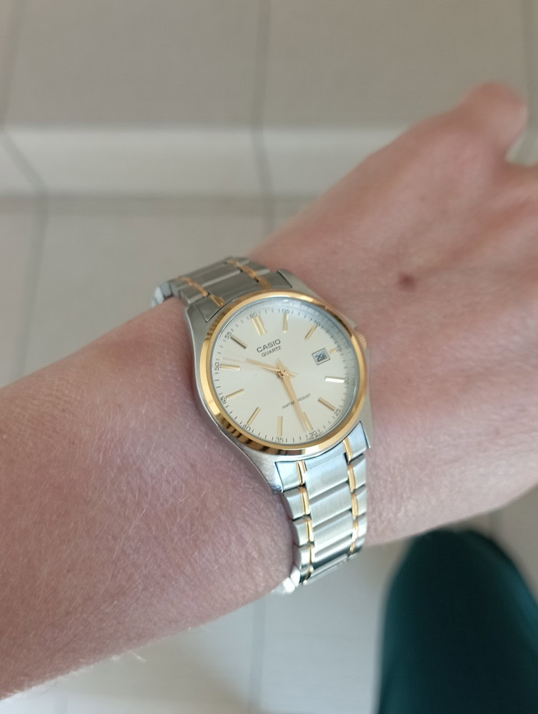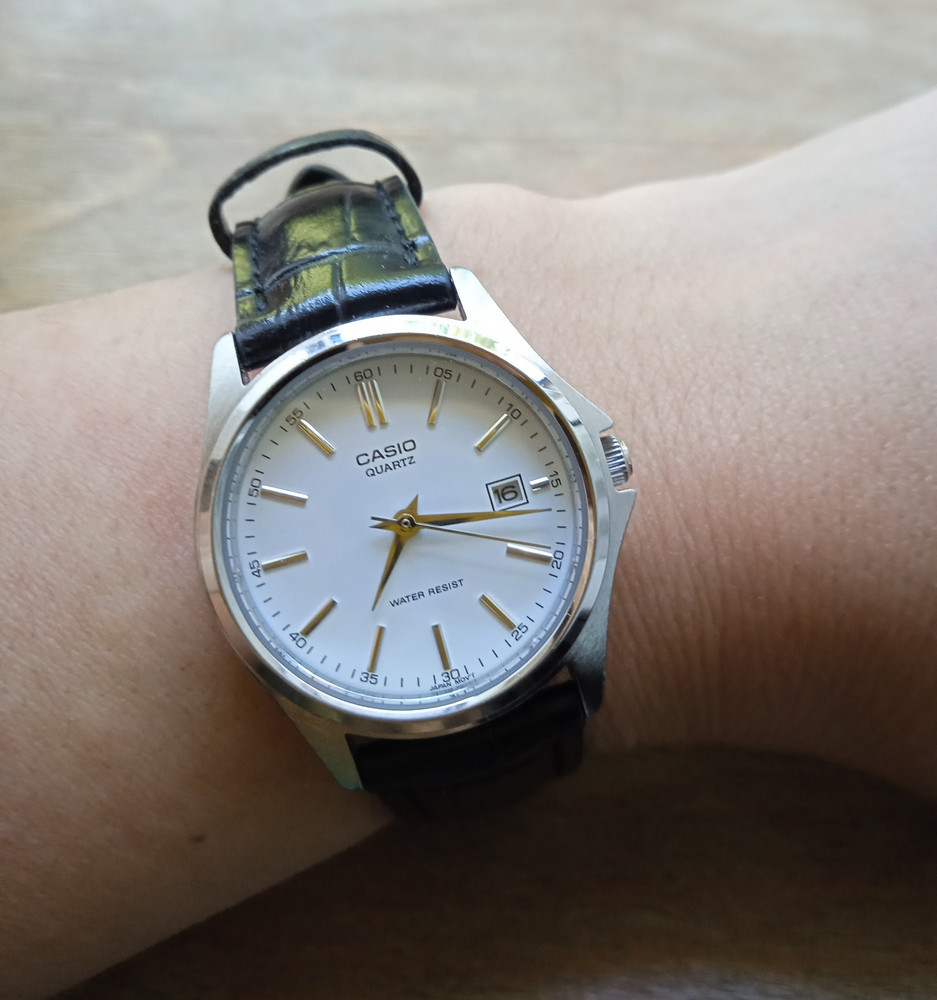 Маловат циферблат. Больше месяца ношу. Вода попадала при мытье рук, но все нормально, вытерла насухо, и ходят, ржавчины нет, подтеков тоже. Дата исправно меняется. Ремешок сначала туговат, где-то через неделю смягчается
