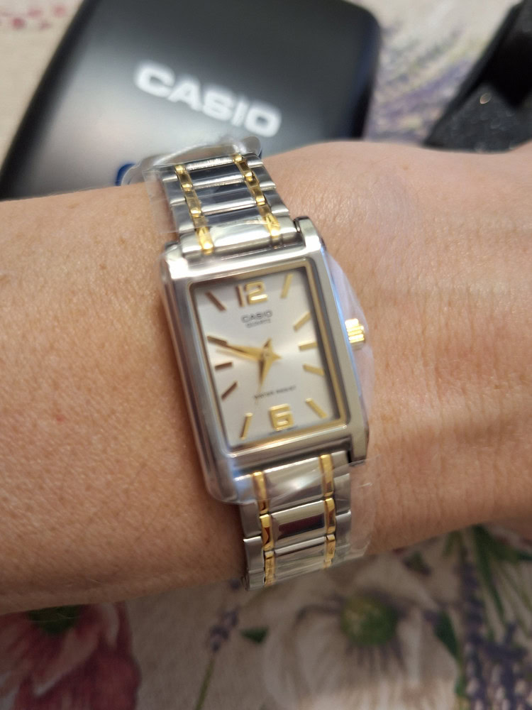Деловые женские наручные часы с частичной позолотой. Часы в металлическом корпусе в форме прямоугольника на удобном литом браслете. Циферблат серебристого цвета с позолоченной окантовкой. Цифрами и стрелками.