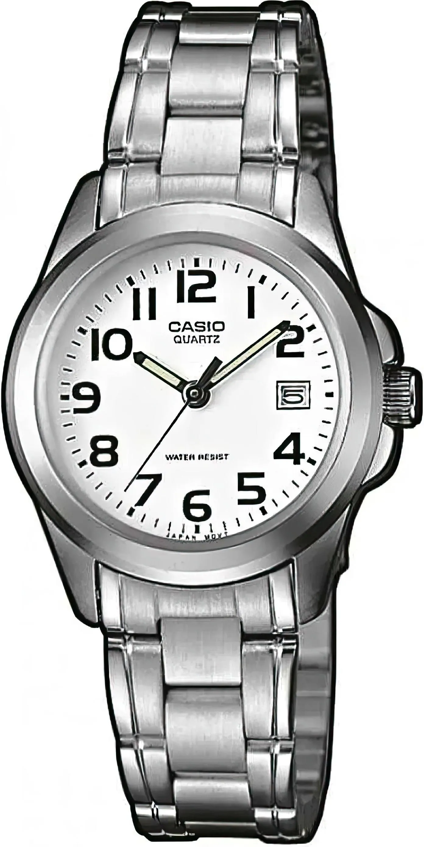 Женские наручные часы в стальном круглом корпусе, секундная стрелка центральная, окошко даты в положении 3 часа на белом циферблате, стрелки светятся в темноте. Модель на стальном браслете.