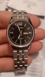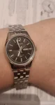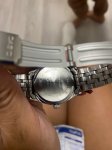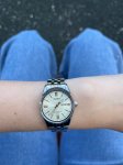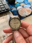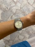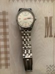 Часики очень красиво смотрятся, не объемные, для женской руки самое то, искала сочетание белого металла и желтого цвета - циферблат сам не белый и с желтым металлом в цифрах, есть указатель дня недели и число. Укоротили на несколько звеньев без проблем. Часы на батарейках, всё отлично работает.