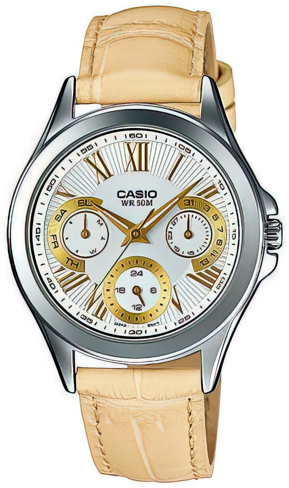 Женские наручные часы Casio Collection LTP-E308L-7A1. Точный кварцевый механизм с аналоговой индикацией. Корпус изготовлен из высококачественной нержавеющей стали 316L с высокими антикоррозийными свойствами. На стрелки и отметки нанесен светонакопительный состав, благодаря этому считывать информацию с циферблата возможно и в темноте. На циферблате отображается текущее число месяца и день недели. Ремешок изготовлен из кожи. Прочное, устойчивое к царапинам минеральное стекло защищает часы от повреждений. Часы являются водонепроницаемыми до 5 Бар. Цвет циферблата: Белый. Ширина (с заводной головкой): 38мм. Толщина: 11мм. Гарантия: 2 года.