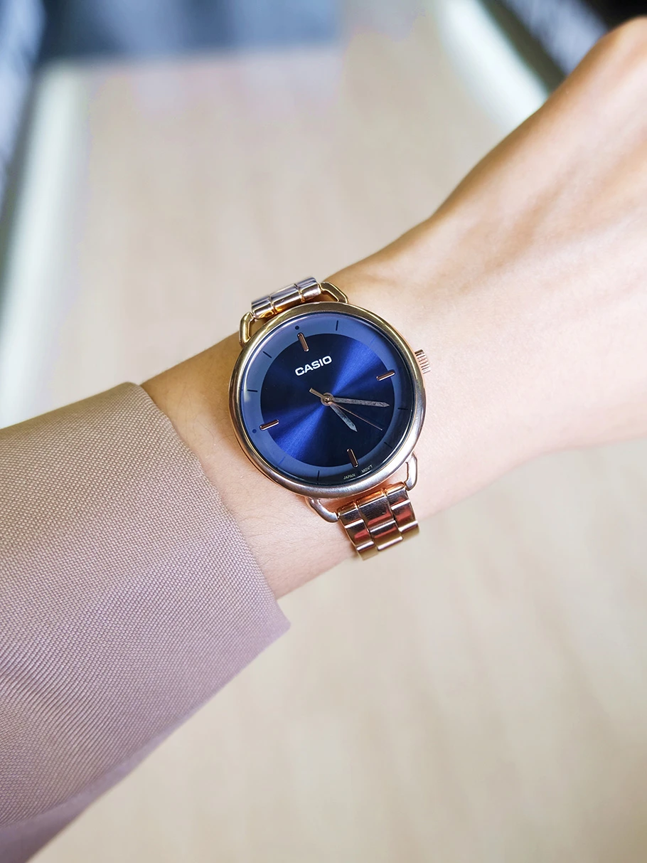 Женские наручные часы Casio Collection LTP-E413PG-2A. Точный кварцевый механизм с аналоговой индикацией. Корпус изготовлен из высококачественной нержавеющей стали 316L с высокими антикоррозийными свойствами. Браслет из нержавеющей стали. Прочное, устойчивое к царапинам минеральное стекло защищает часы от повреждений. Часы являются водонепроницаемыми до 3 Бар. Цвет циферблата: Синий. Ширина (с заводной головкой): 37мм. Толщина: 8мм. Гарантия: 2 года.