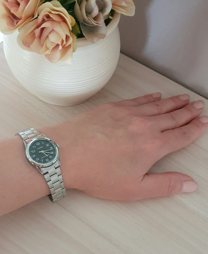 Часики замечательные. Несмотря на металлический браслет, они легкие. Люблю носить свободно, не буду убирать звенья. Хотела часы именно с арабскими цифрами и черным циферблатом. Размер не массивный, смотрятся аккуратно. Спасибо продавцу.