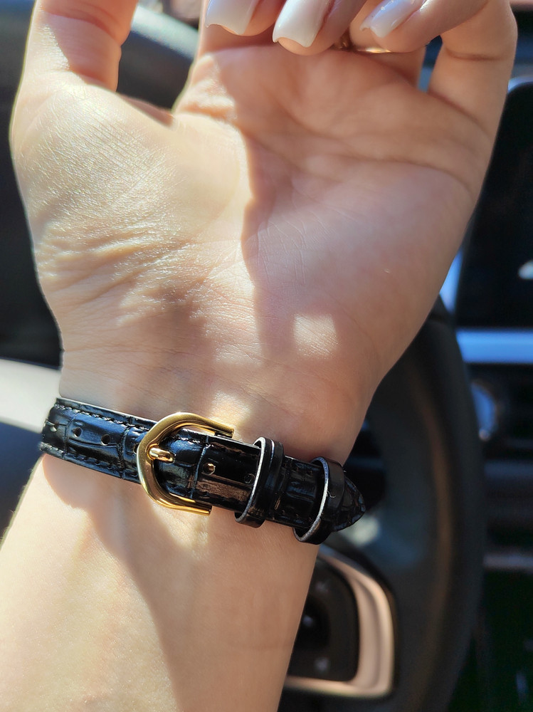 Женские наручные часы в круглом корпусе с позолотой, секундная стрелка центральная, на кожаном ремешке черного цвета.