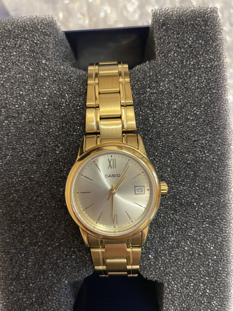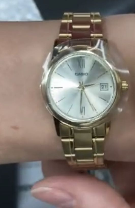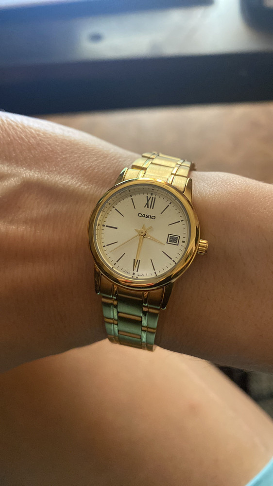 Женские наручные часы Casio Collection LTP-V002G-9B3. Точный кварцевый механизм с аналоговой индикацией. Корпус изготовлен из высококачественной нержавеющей стали 316L с высокими антикоррозийными свойствами. На циферблате отображается текущее число месяца. Браслет из нержавеющей стали. Прочное, устойчивое к царапинам минеральное стекло защищает часы от повреждений. Часы являются водонепроницаемыми до 3 Бар. Цвет корпуса: Желтое золото. Цвет циферблата: Золотистый. Гарантия: 2 года.